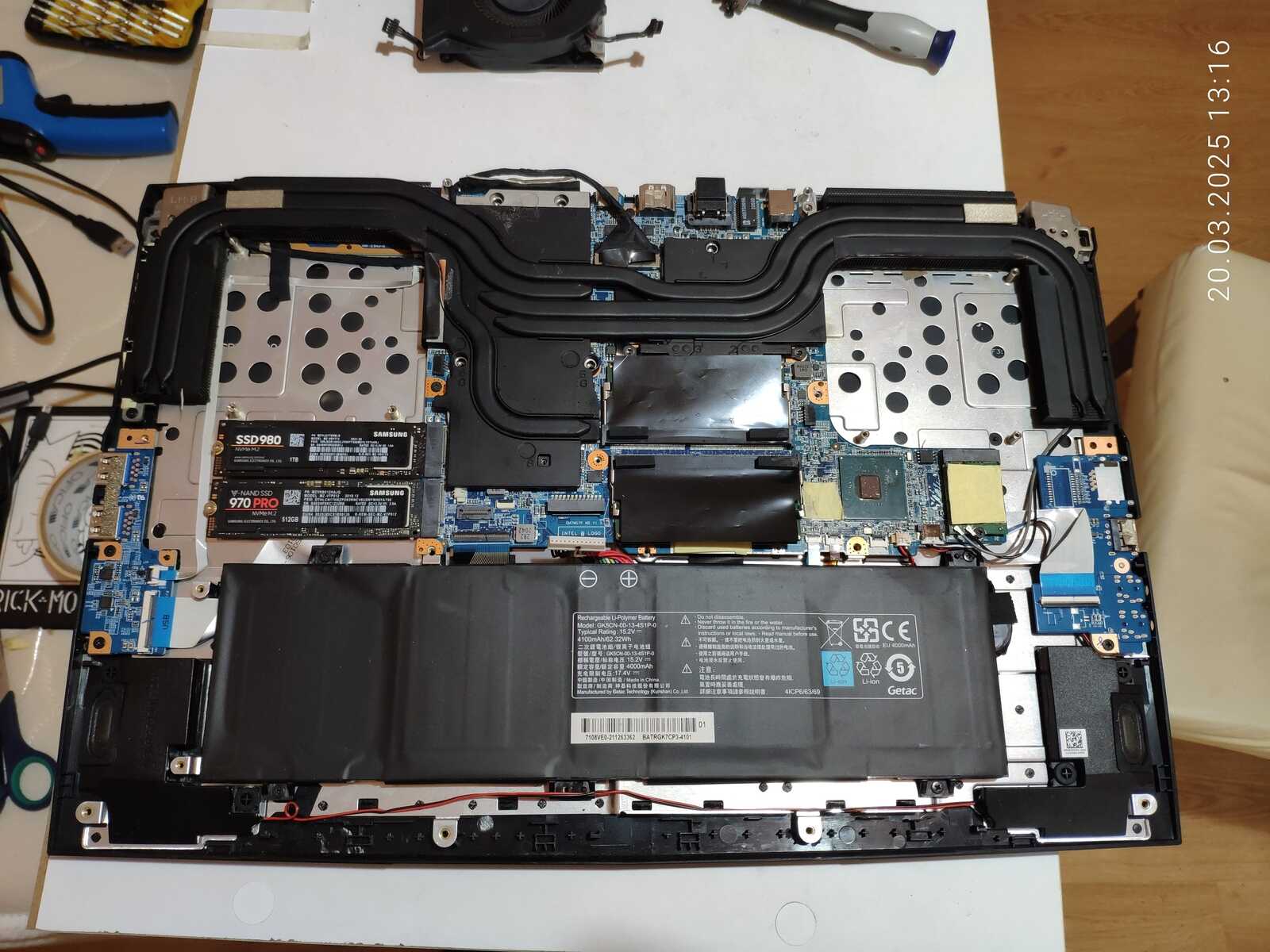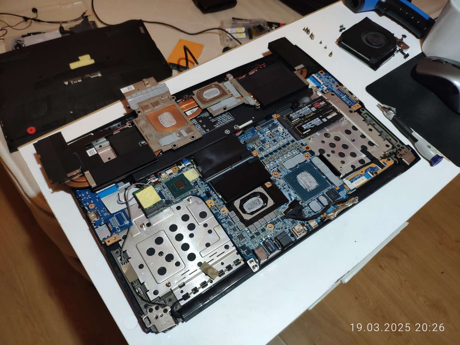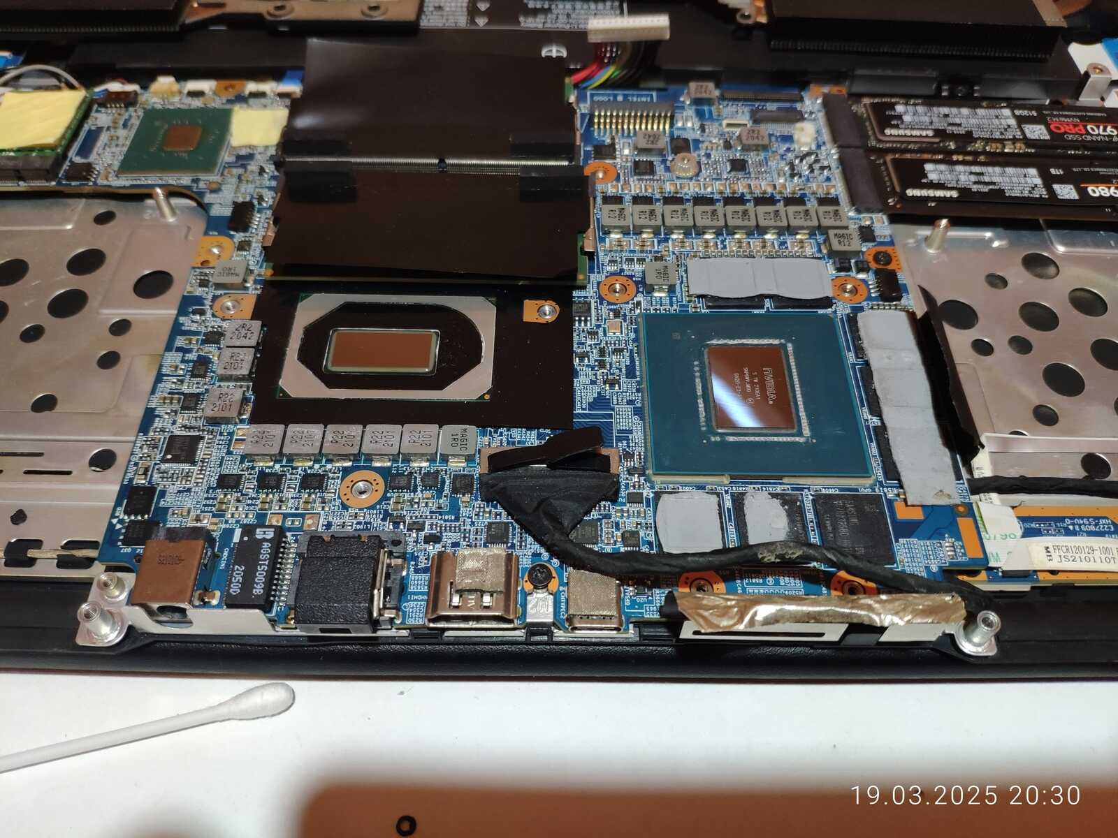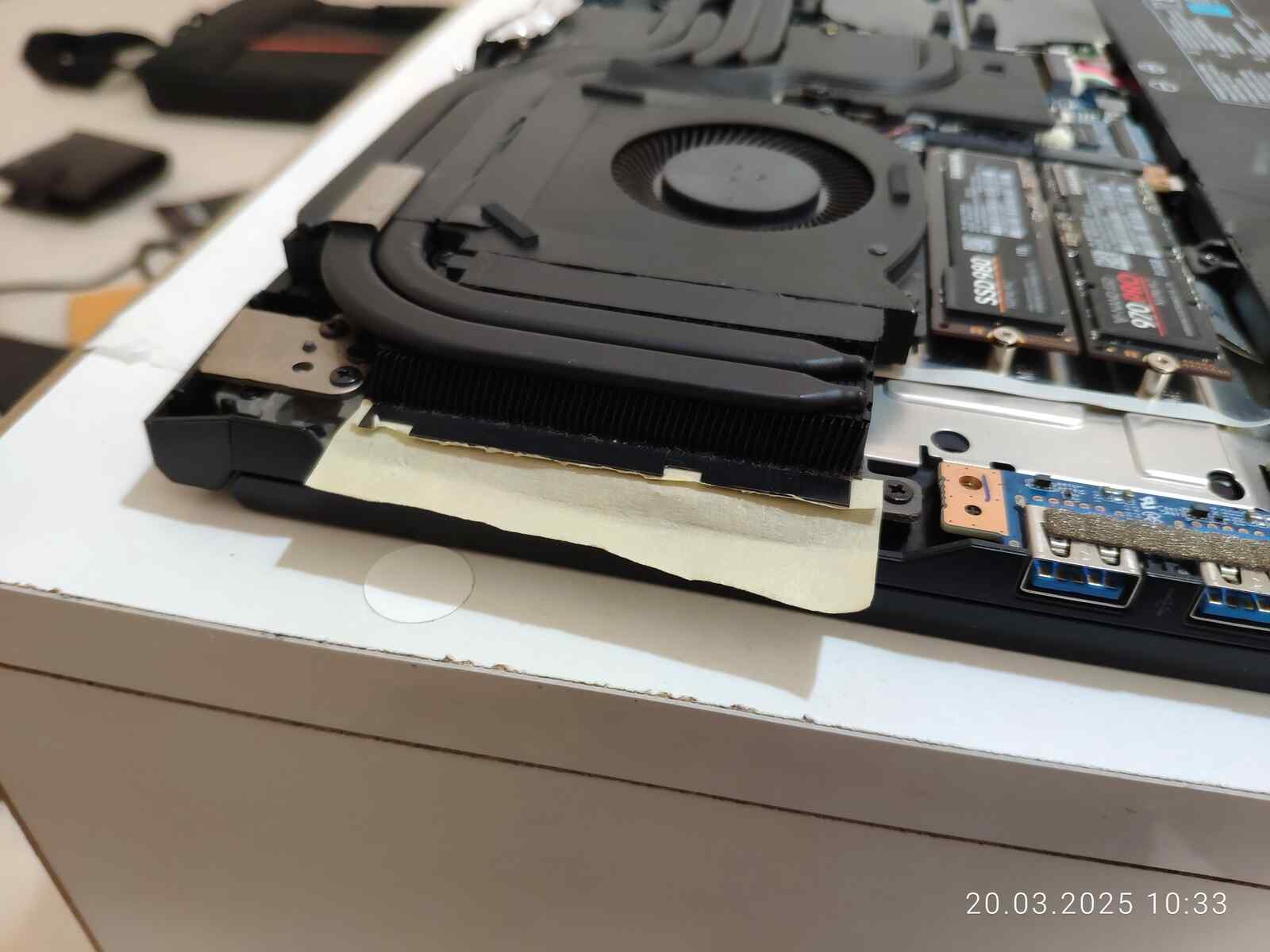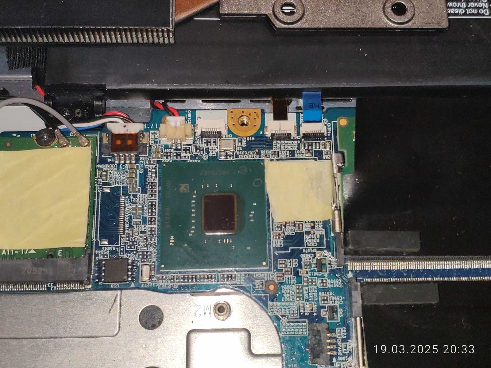 Ладно, расчехляем ноутбук, отключаем аккумулятор, снимаем систему охлаждения и приступаем к осмотру.