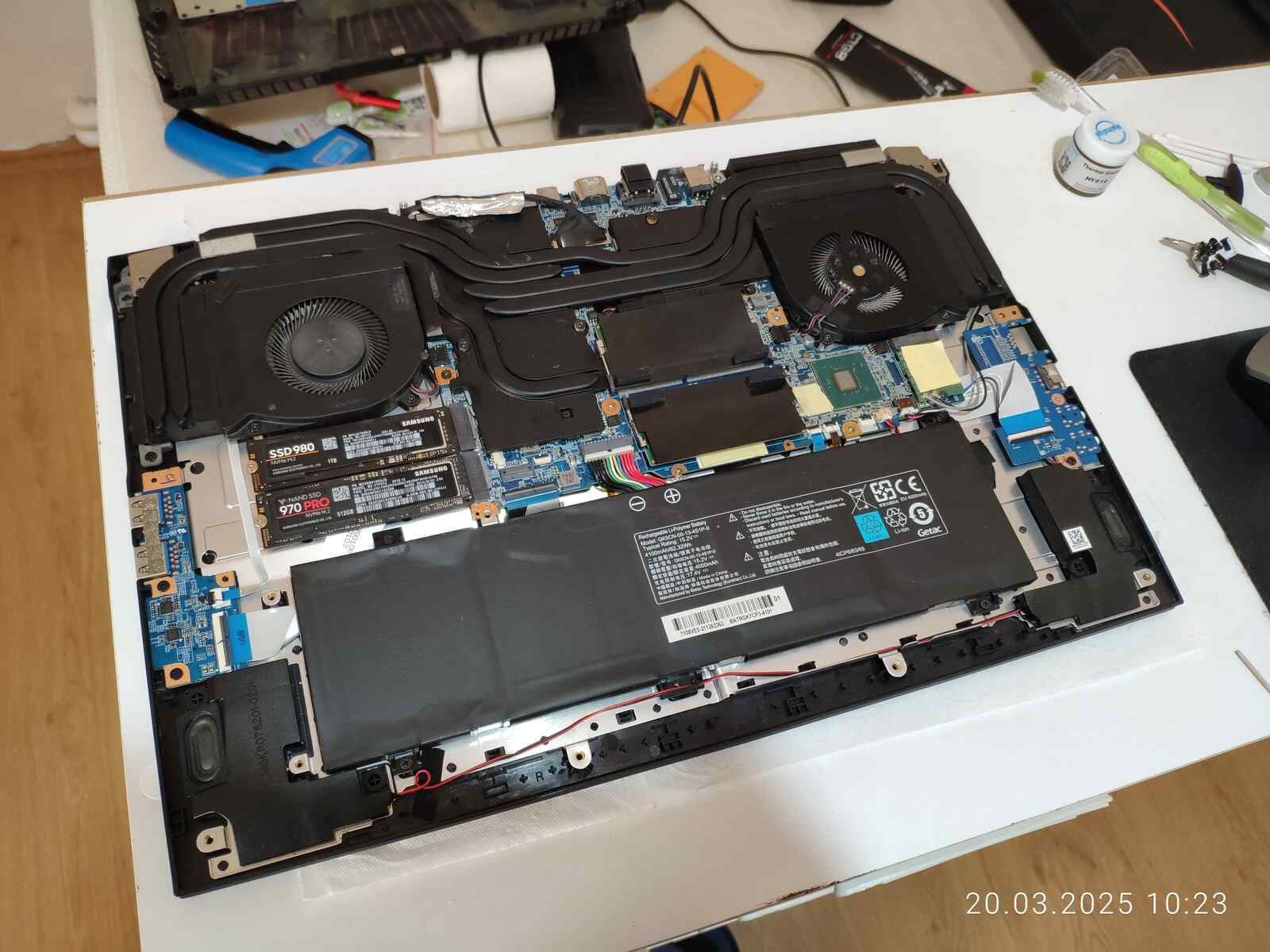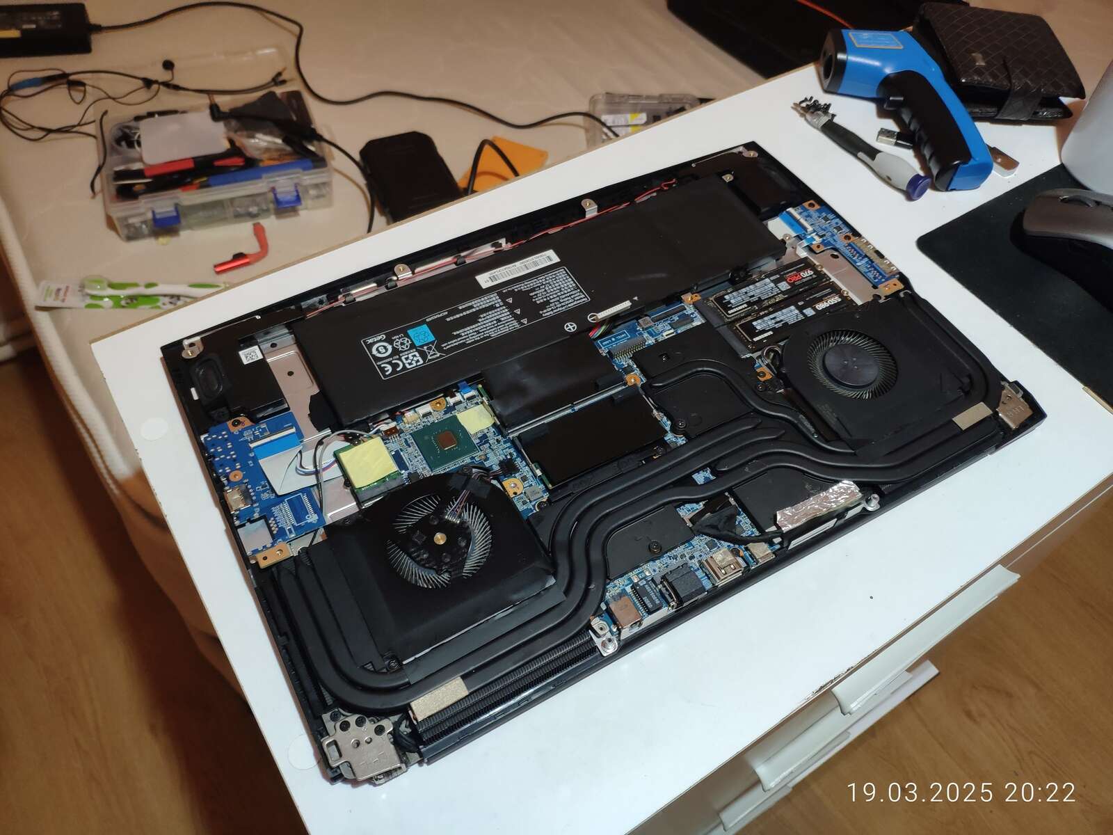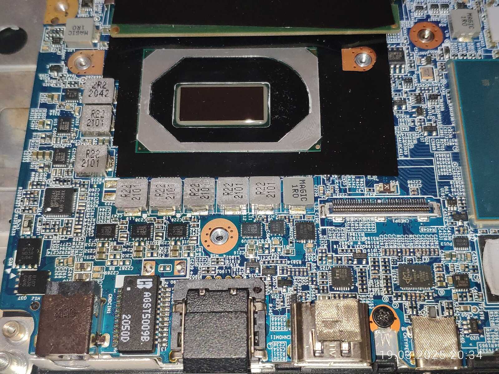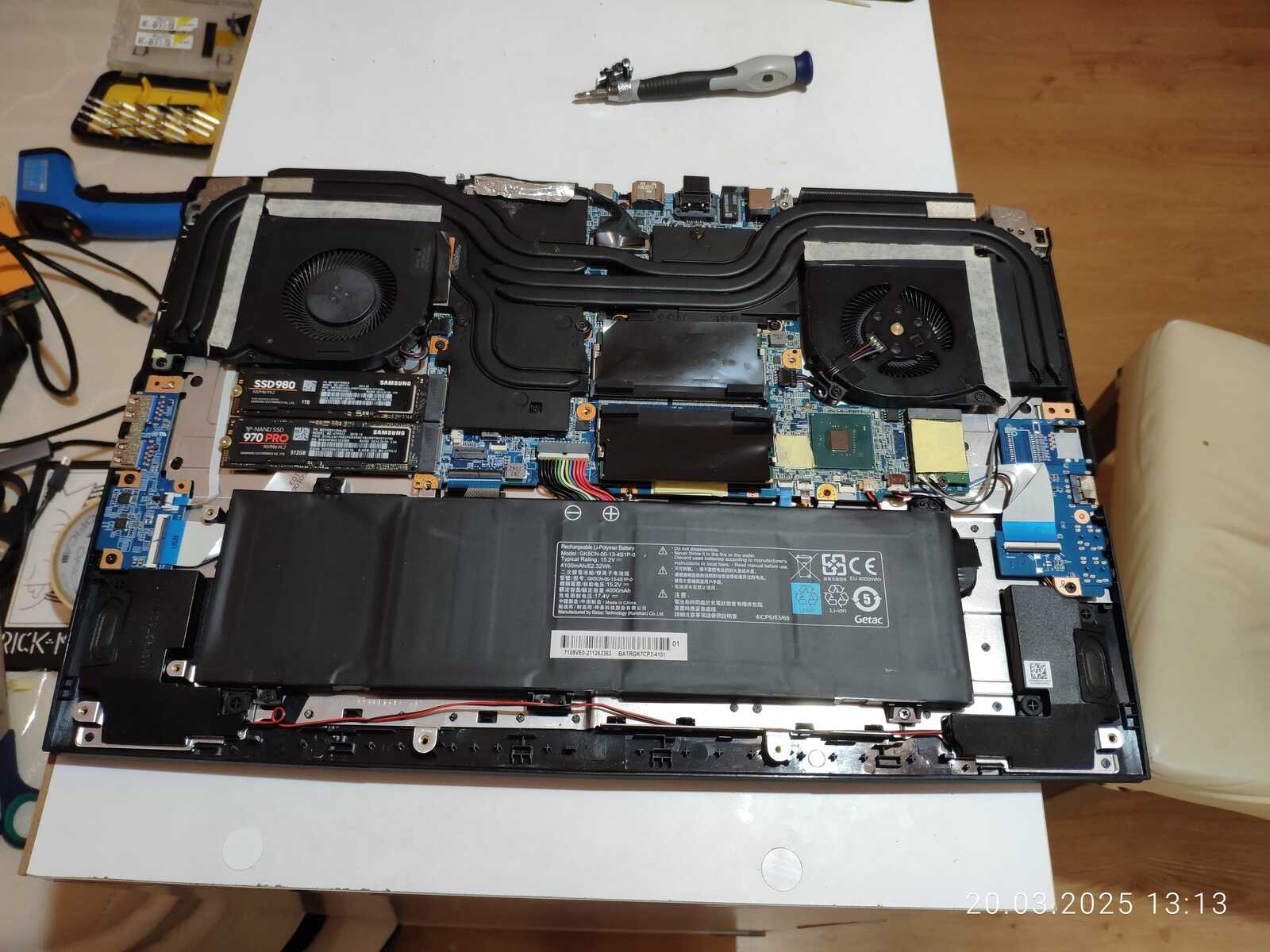 Ладно, расчехляем ноутбук, отключаем аккумулятор, снимаем систему охлаждения и приступаем к осмотру.