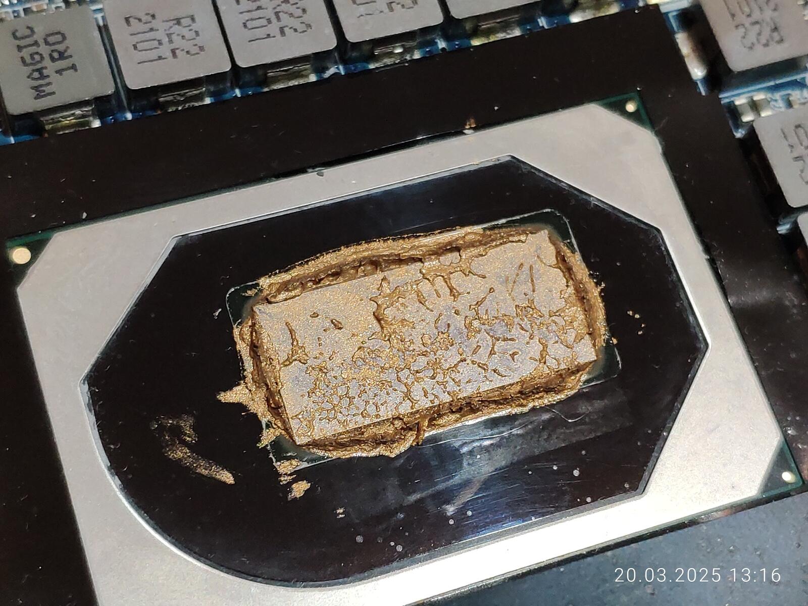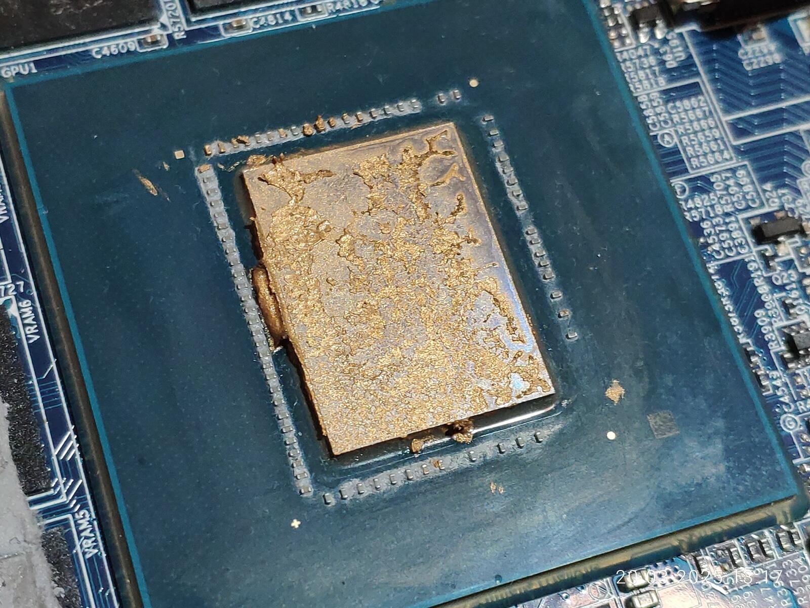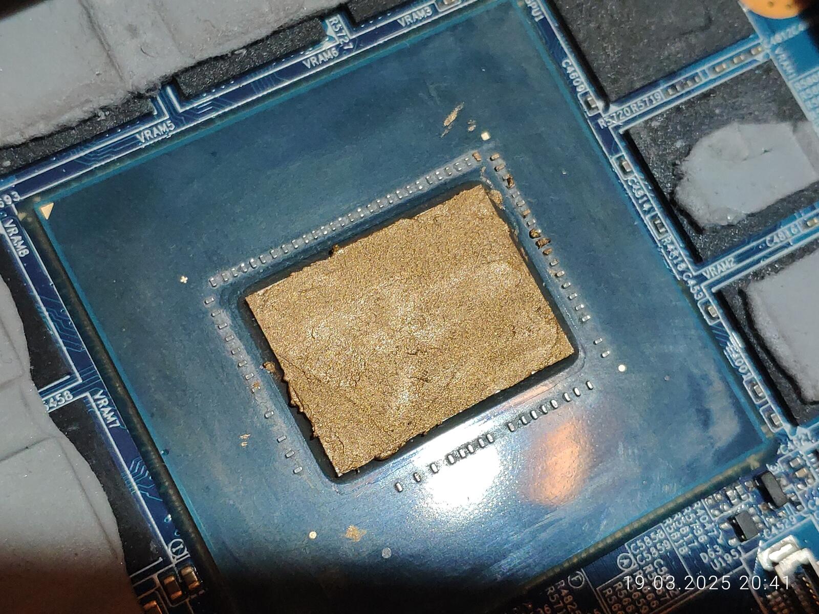 На кристаллах ЦП и ГП всё неплохо, паста оказалась на всей площади, хотя по углам конечно можно было и докинуть немного, так же можно заметить незначительное количество наполнителя прозрачного, чего ещё было ожидать от дешёвой пасты.