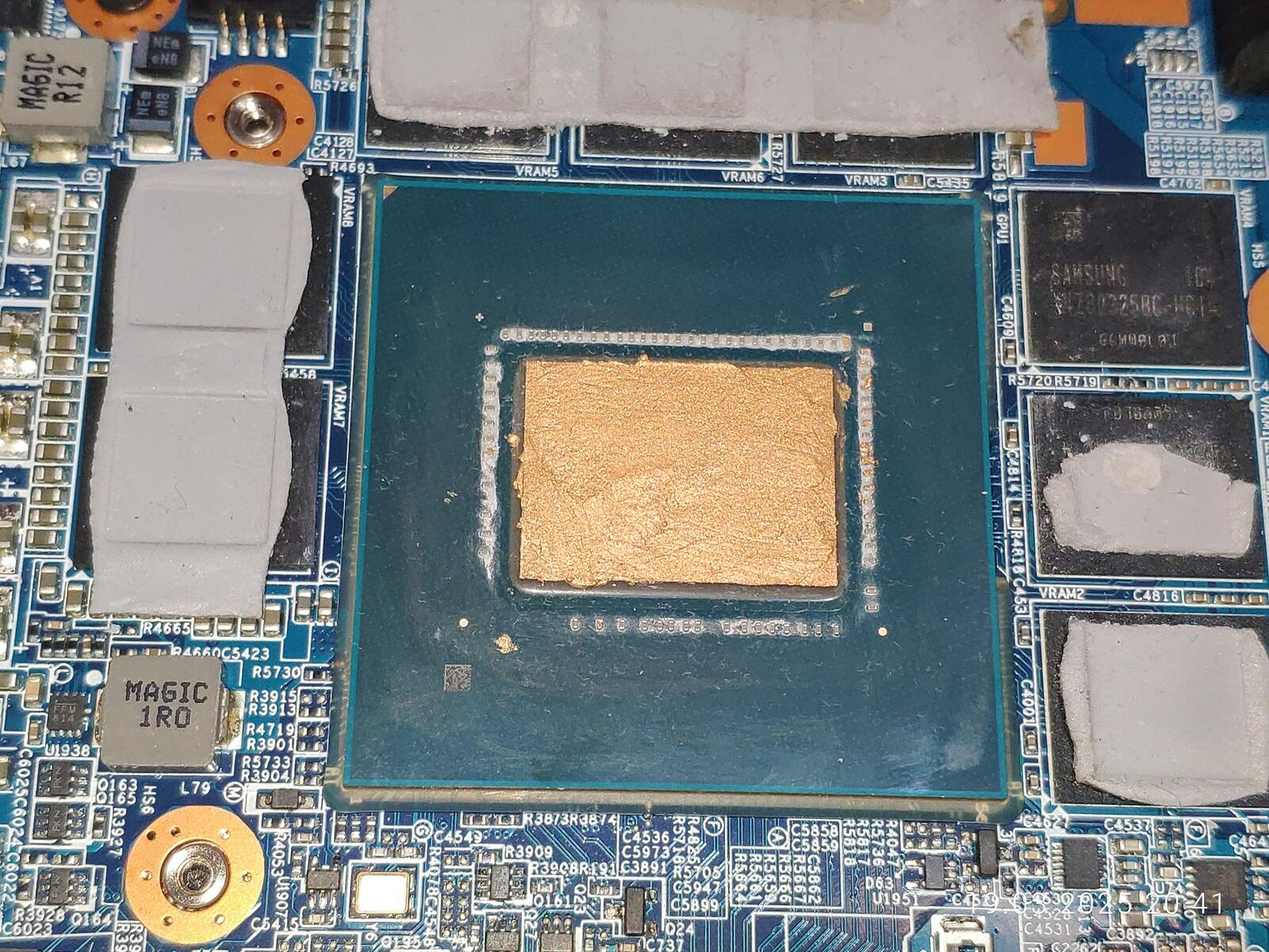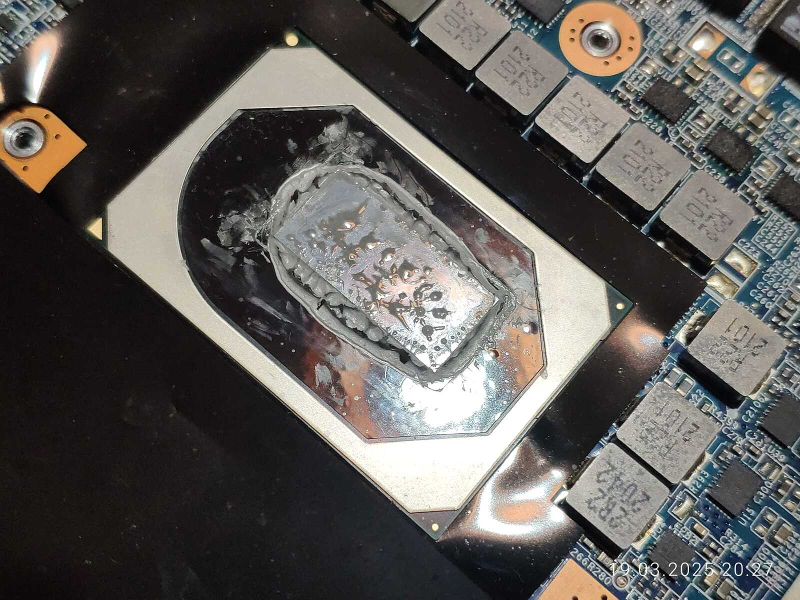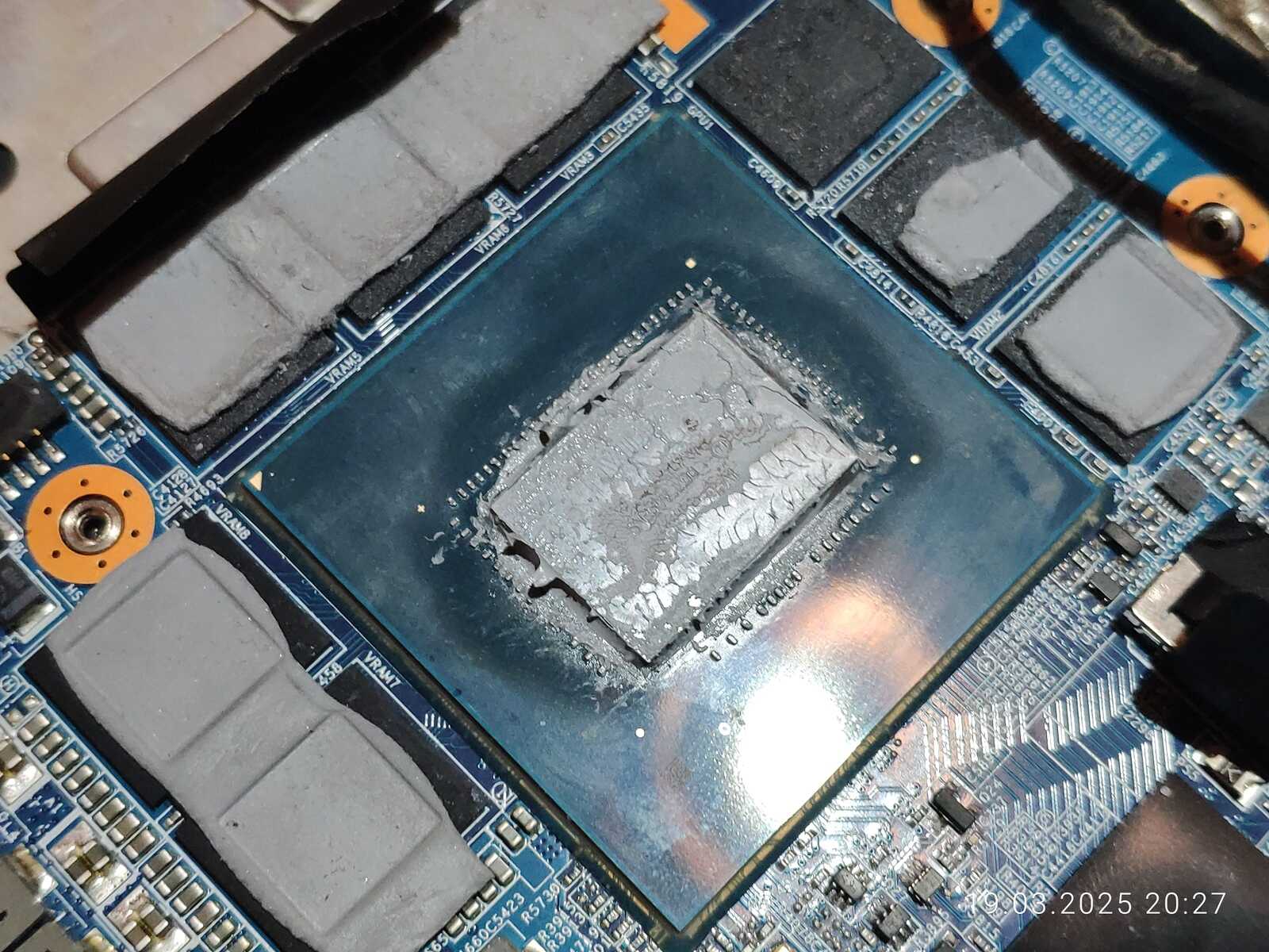 На кристаллах ЦП и ГП всё неплохо, паста оказалась на всей площади, хотя по углам конечно можно было и докинуть немного, так же можно заметить незначительное количество наполнителя прозрачного, чего ещё было ожидать от дешёвой пасты.