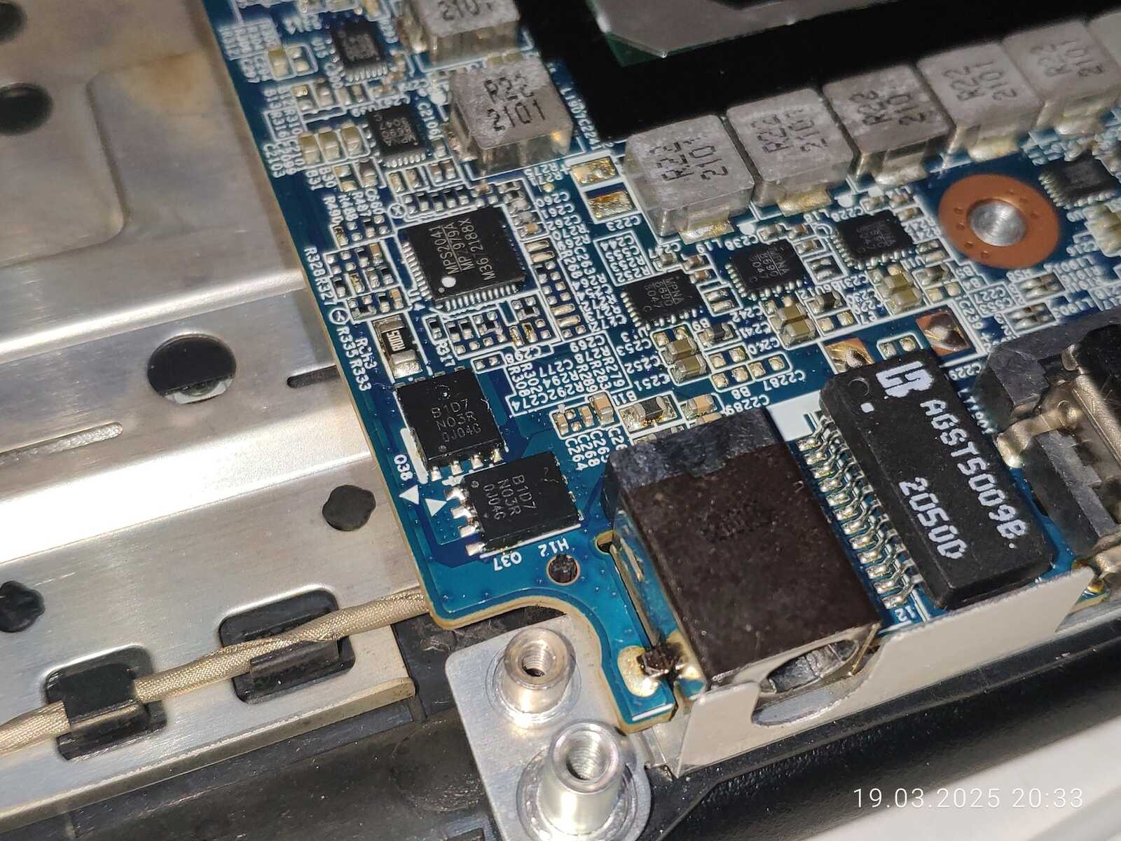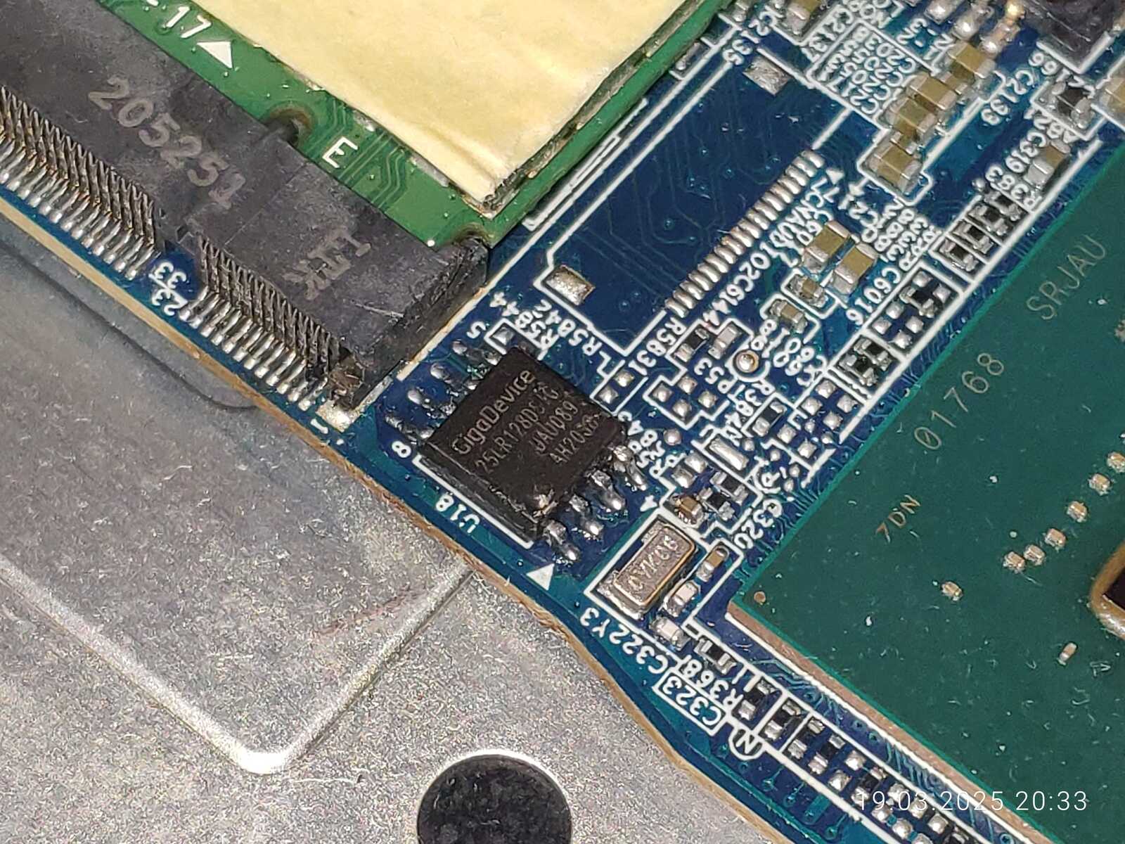 Осматриваем чипсет HM470 и микросхему с прошивкой, вот тут и обнаружились следы пайки, аж слот рядом немного подпалили, впрочем, это не проблема, хотя и неприятный факт, это означает что с ноутбуком уже были проблемы, хотя подозрения были и раньше, ведь серийные номера не совпадали на поддоне и в BIOS, вот и ответ на вопрос "почему".