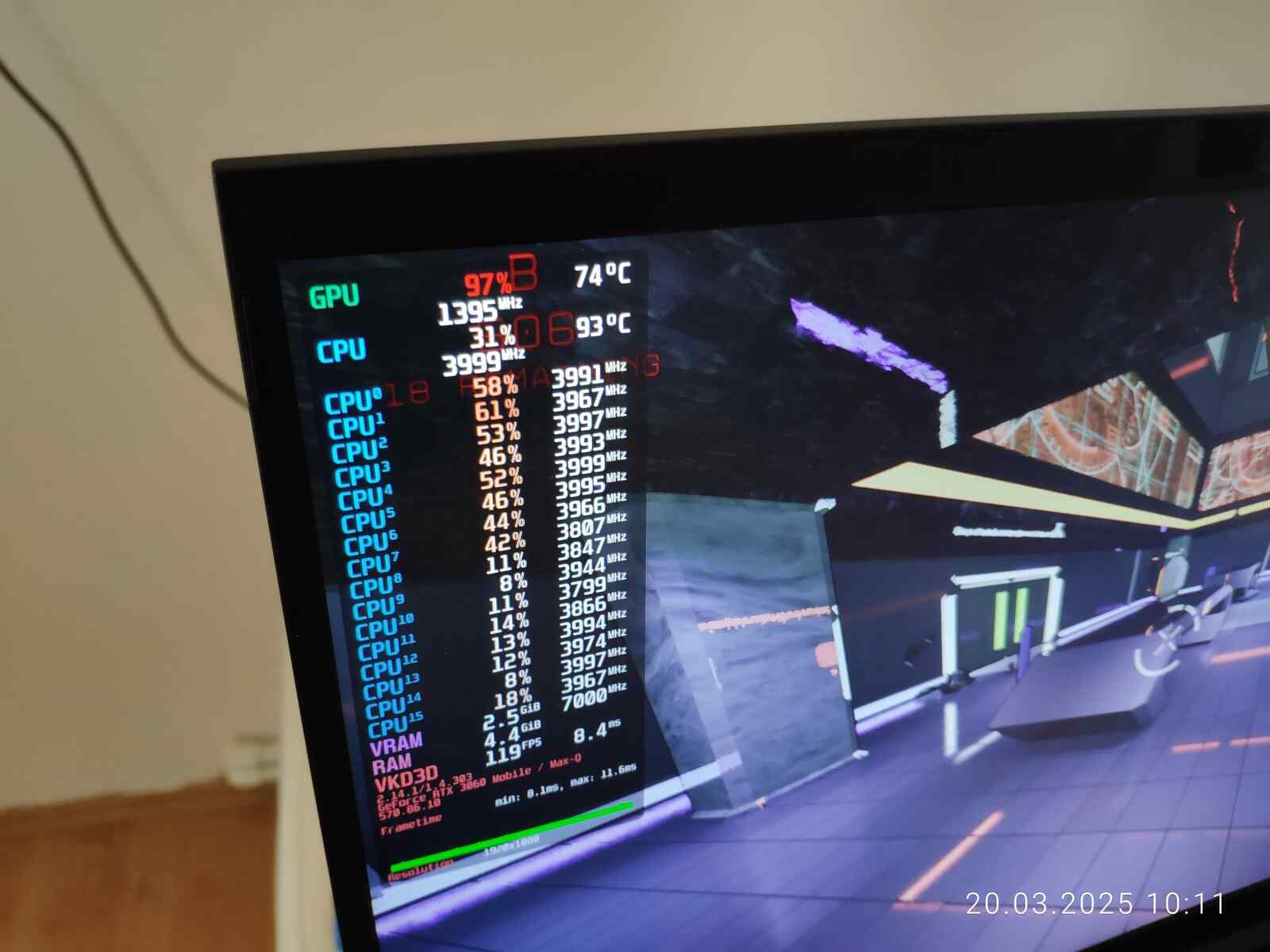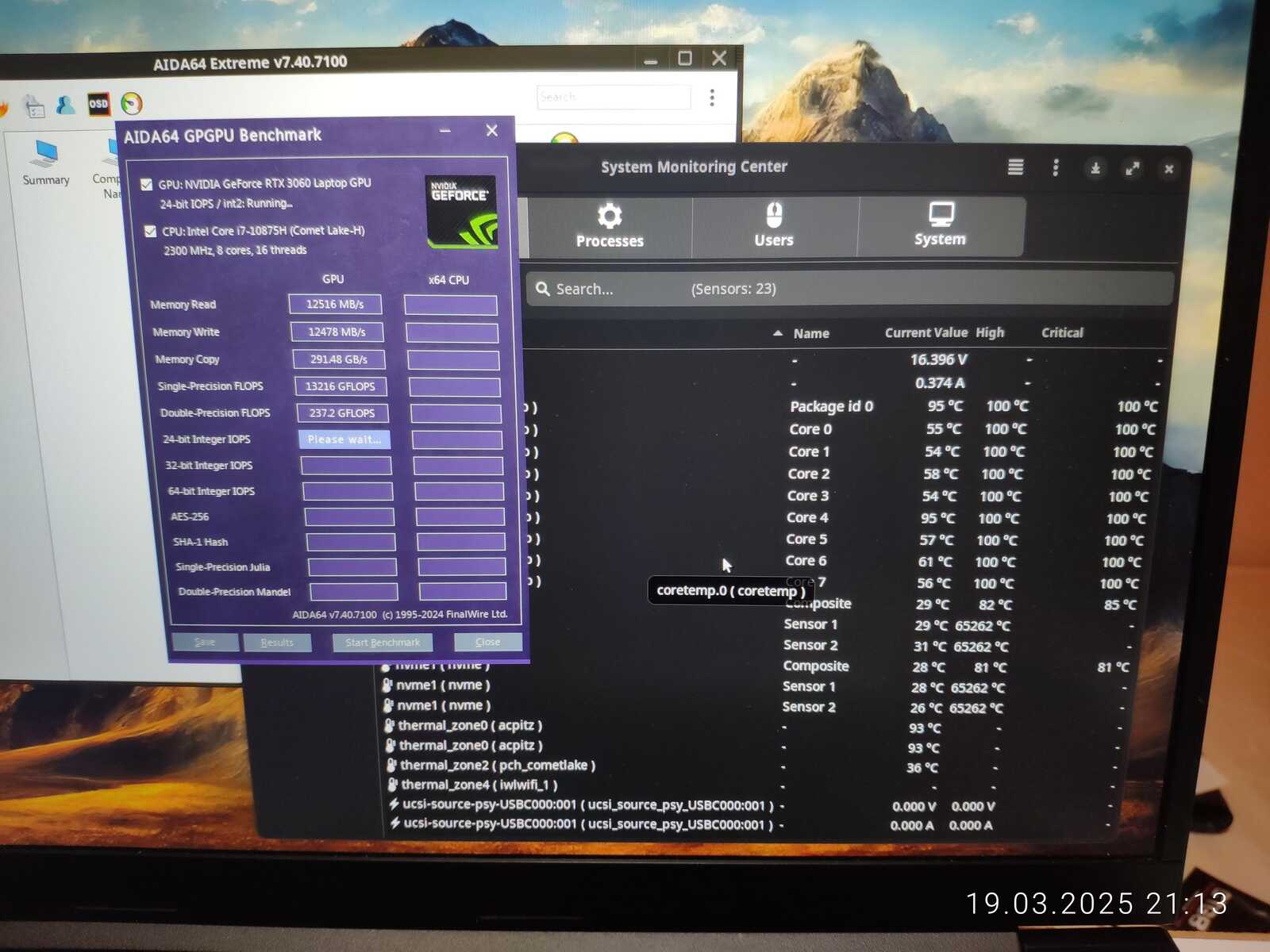 Но уже с первых тестов становится ясно, что процессор всё равно разогревается до 95 градусов при нагрузке на одно ядро, да, во время тестирования GPU процессор загружен на одно ядро, хотя температуры ГП вполне в норме, вообще охладить RTX 3060 наверное можно даже с помощью КПТ-8, но не процессор.
