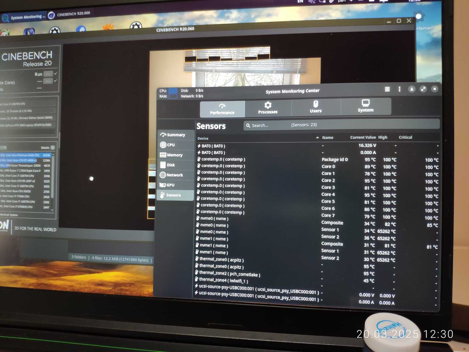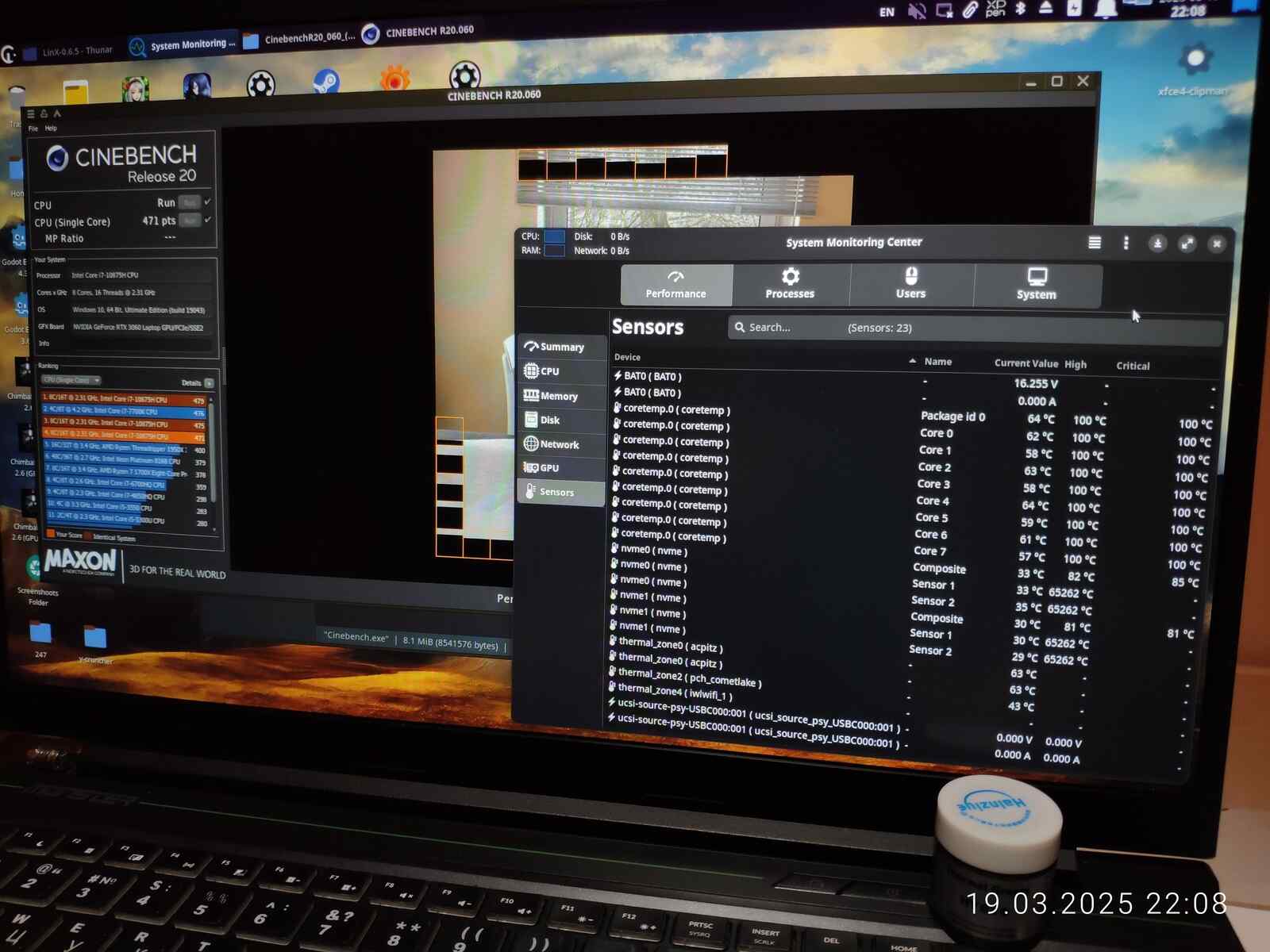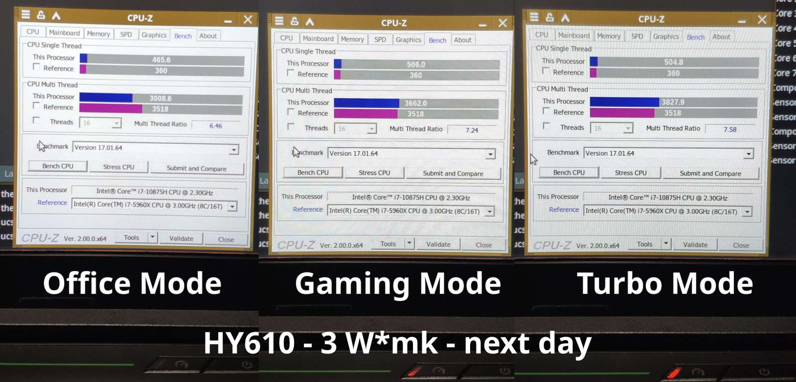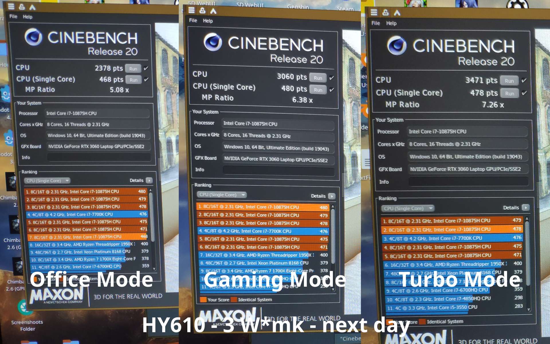 Однако есть и проблема, i7-10875H невероятно горячий, да, там где Ryzen 7 4800H при 4.2 ГГц мог выдавить из себя 170-180 FPS, Intel Core в офисном режиме с лимитом до 15 Вт и частотой около 3.5 ГГц не напрягаясь выдал 240+ FPS, но господи, какой же он горячий, Ryzen тоже был не из холодных процессоров, особенно 5800H (Zen 3), который бы мог тягаться с i7-10875H по производительности ядер на равной частоте, в отличие от 4800H (Zen 2), но всё же...