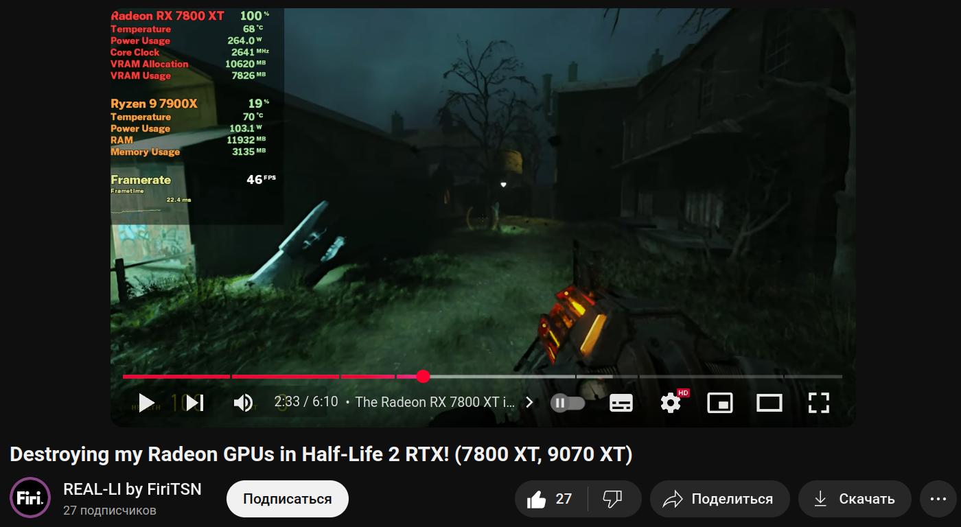 Тот момент, когда Radeon RX 7800XT при мощности 265 Вт смогла выдать целых 46 FPS в игре с трассировкой лучей, а мобильная RTX 3060 мощностью 80 Вт выдала всего 52 FPS при таких же настройках, эх, надо было брать Radeon, отличные видеокарты говорят некоторые любители AMD...
