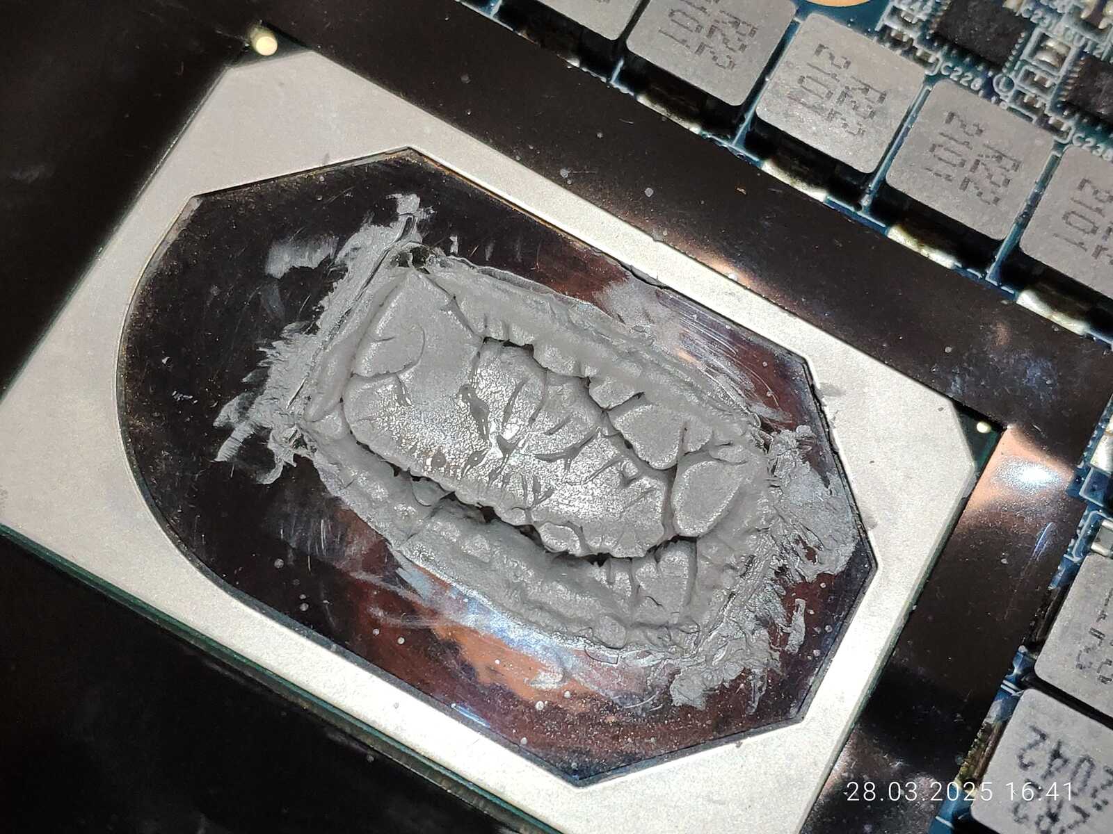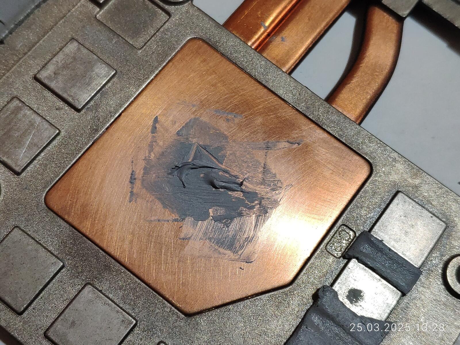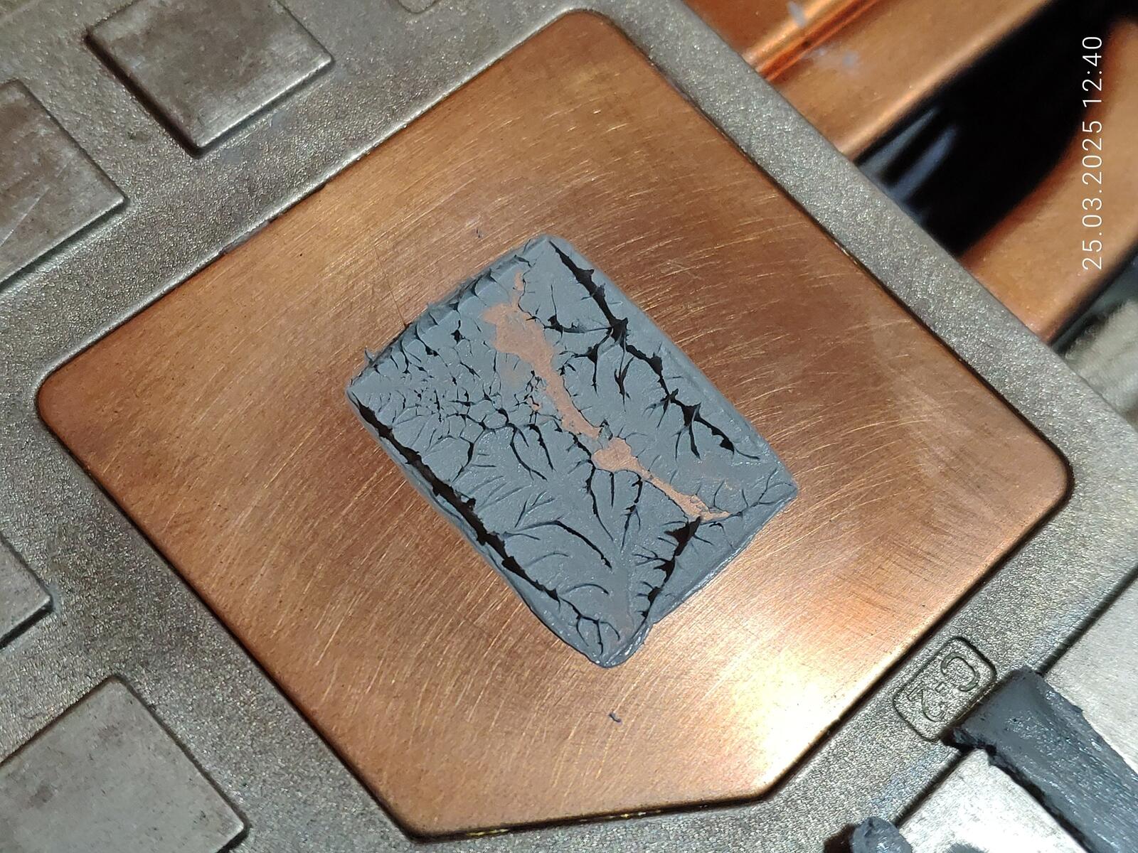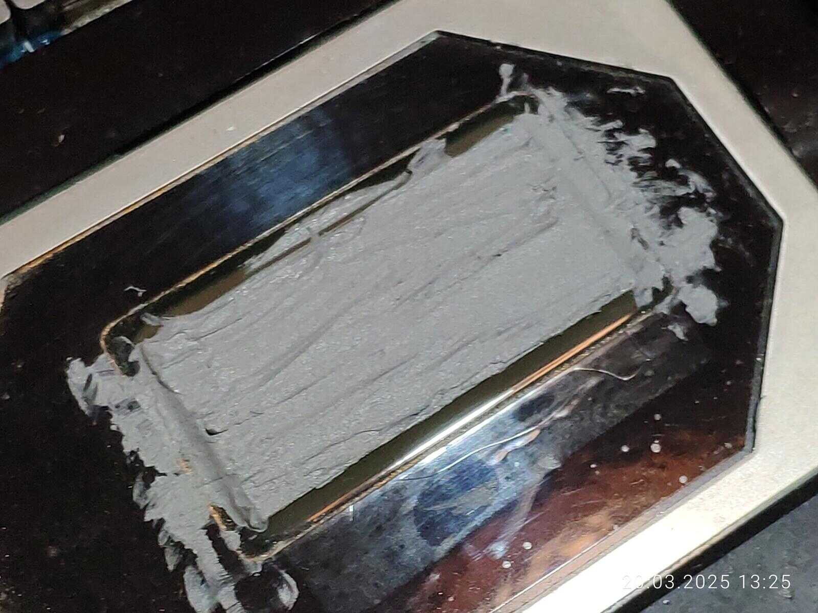 Расслоение произошло именно там, где наносилась CTG8 в первый раз, хоть паста и была размазана, но столь очевидную взаимосвязь тяжело не заметить, тут есть два варианта, дорогую пасту тоже нужно тщательно перемешивать перед использованием, как и дешёвую, либо с пастой всё хорошо, просто именно эта часть кристалла оказалась самой горячей по удачному стечению обстоятельств.