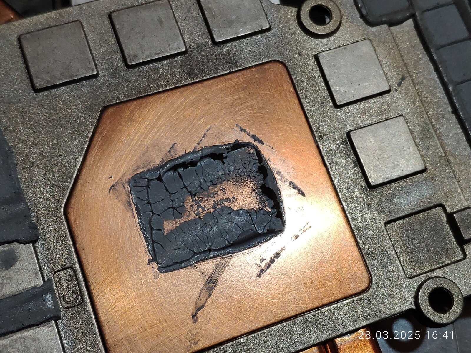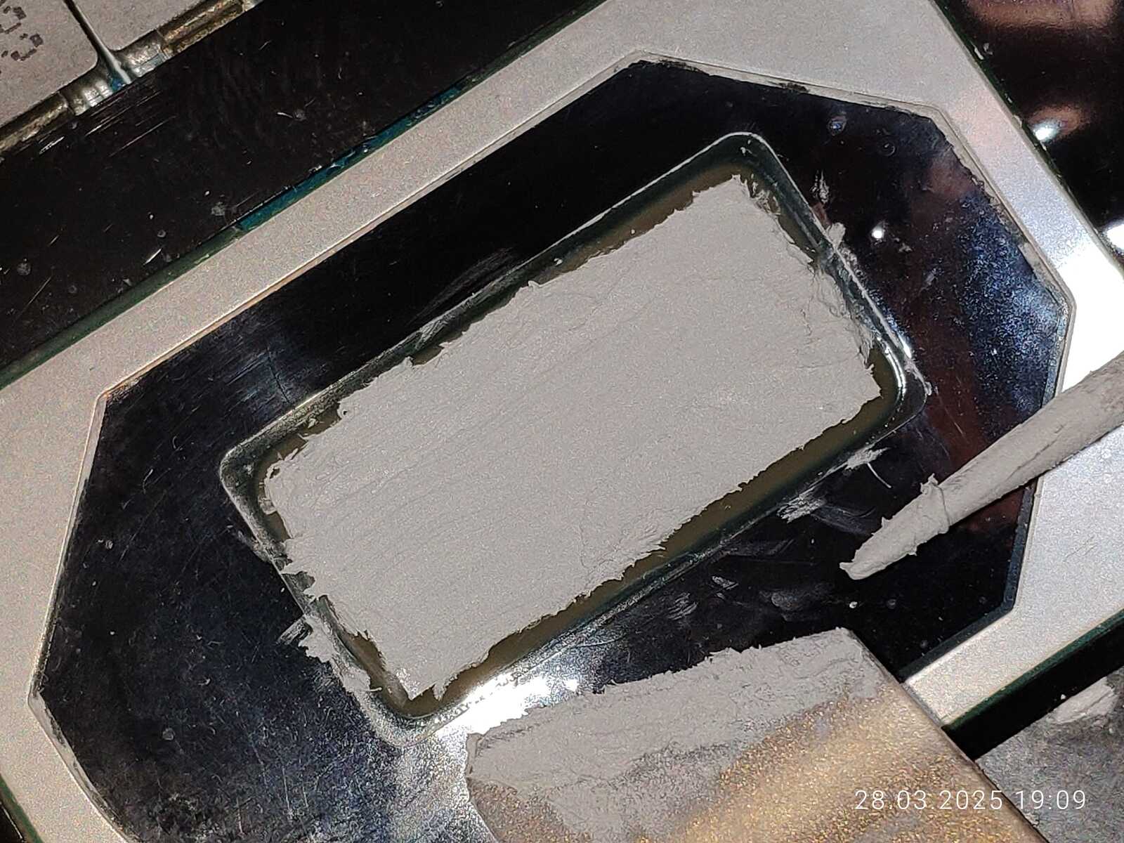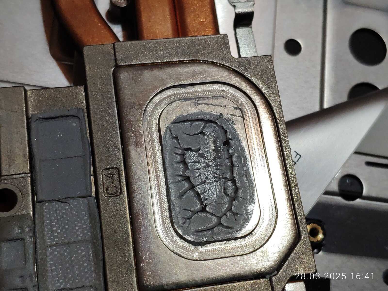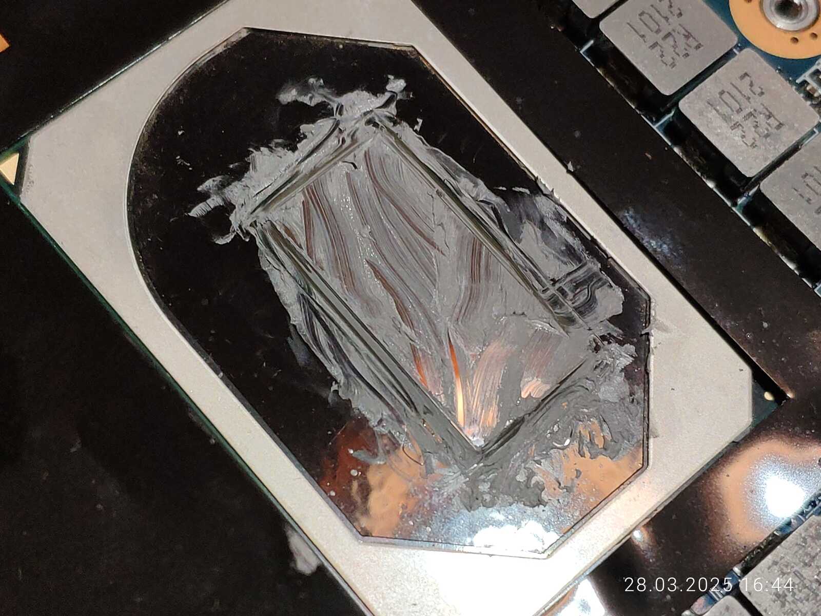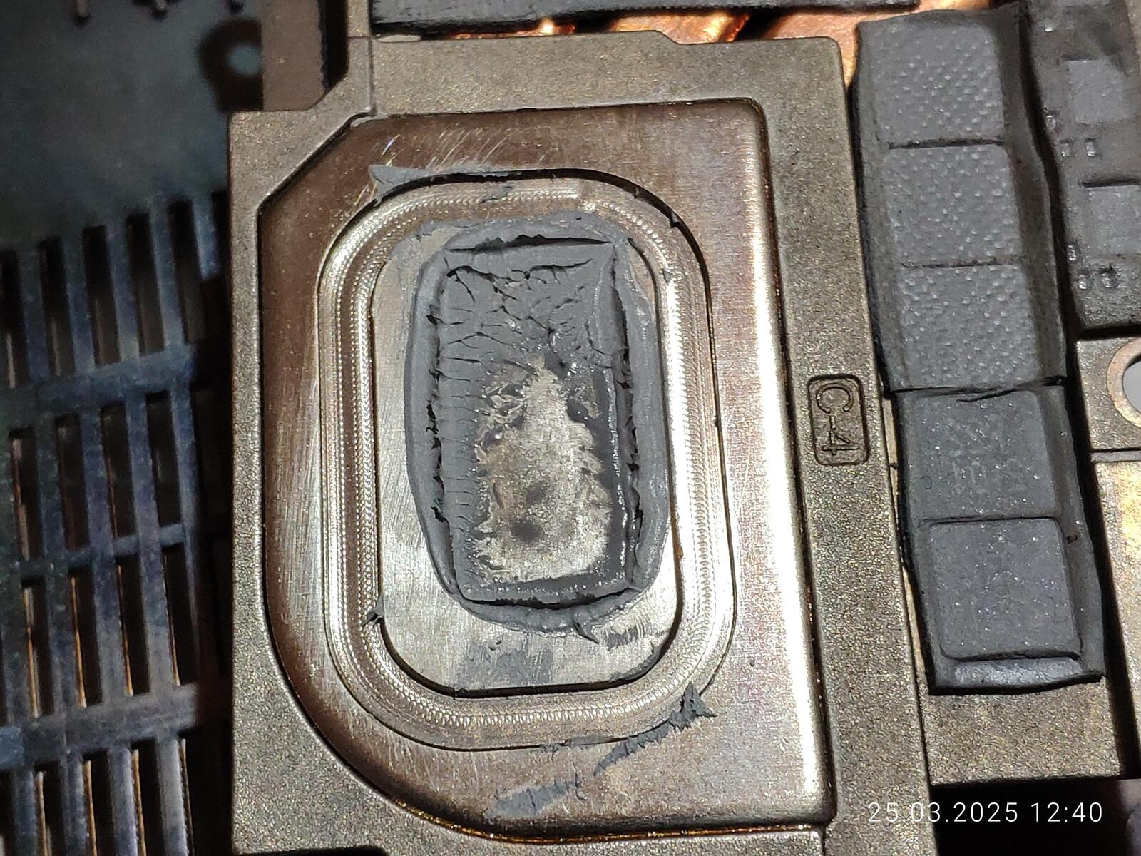 Расслоение произошло именно там, где наносилась CTG8 в первый раз, хоть паста и была размазана, но столь очевидную взаимосвязь тяжело не заметить, тут есть два варианта, дорогую пасту тоже нужно тщательно перемешивать перед использованием, как и дешёвую, либо с пастой всё хорошо, просто именно эта часть кристалла оказалась самой горячей по удачному стечению обстоятельств.