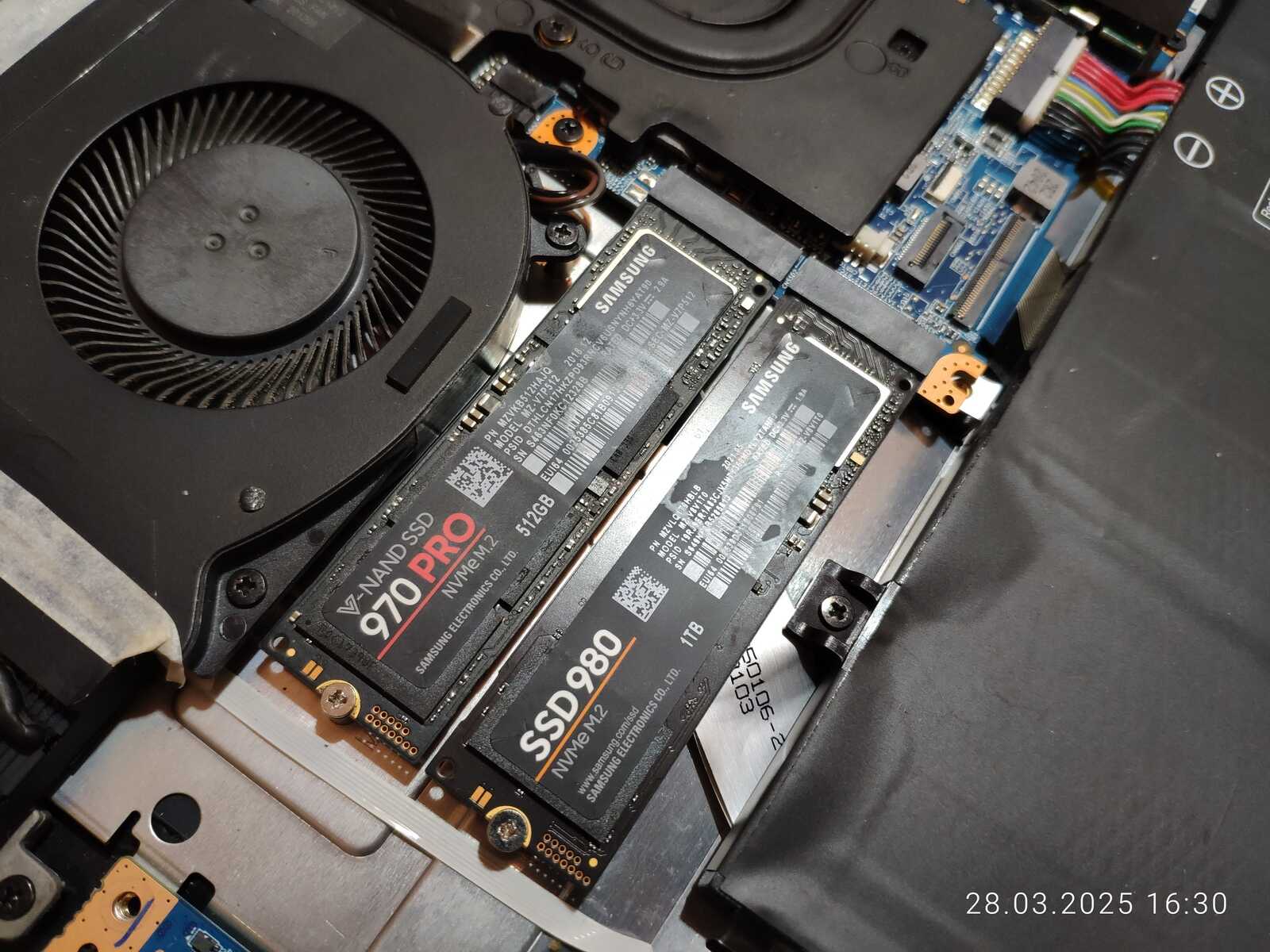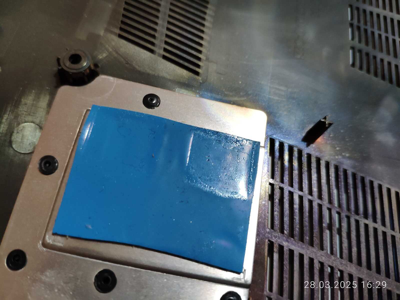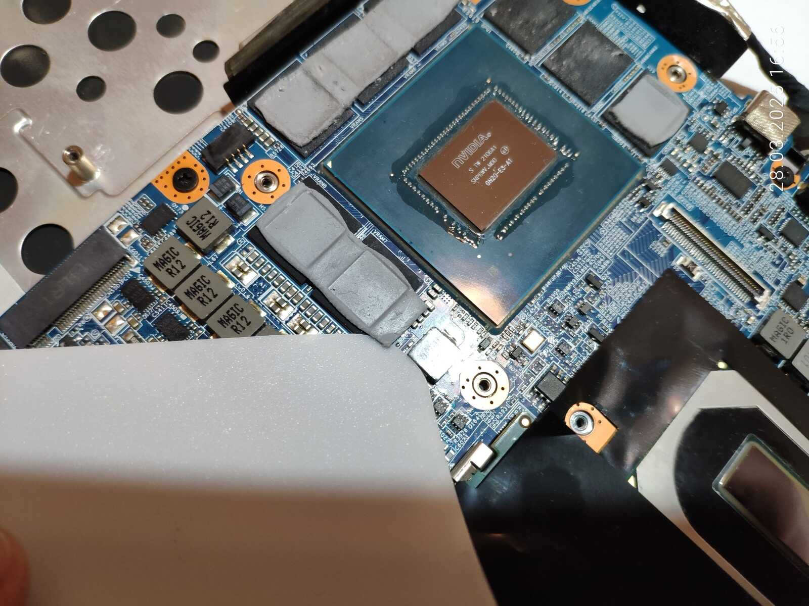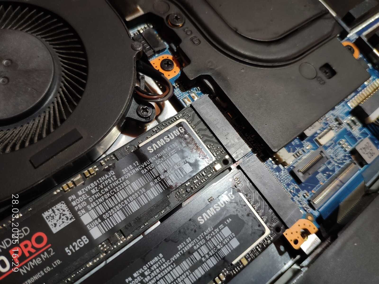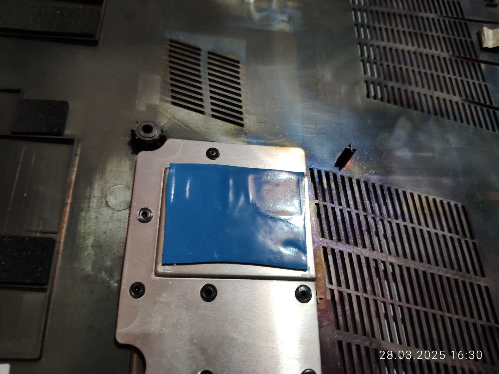 Ладно, вернёмся к очередной разборке, на этот раз уже взял второй ноутбук и микроскоп китайский, чтобы тщательнее осмотреть всё, но сейчас будем обращать внимание только на прокладки и пасту, вот что заметил, голубая прокладка охлаждения SSD потекла, у MSI тоже текли прокладки, но они контактировали с задней стороной накопителей, а тут прямо фасад залило выделениями, ладно...