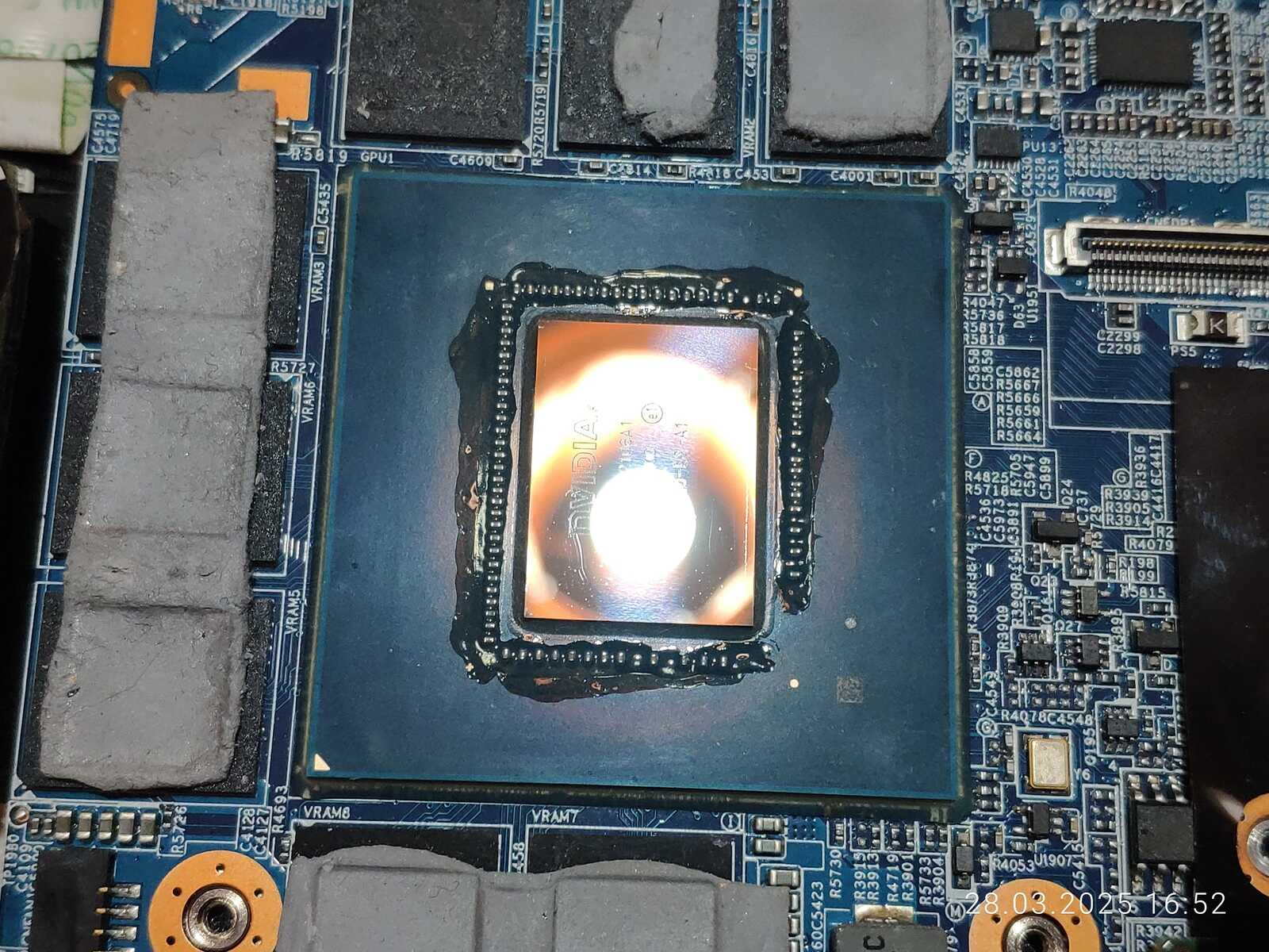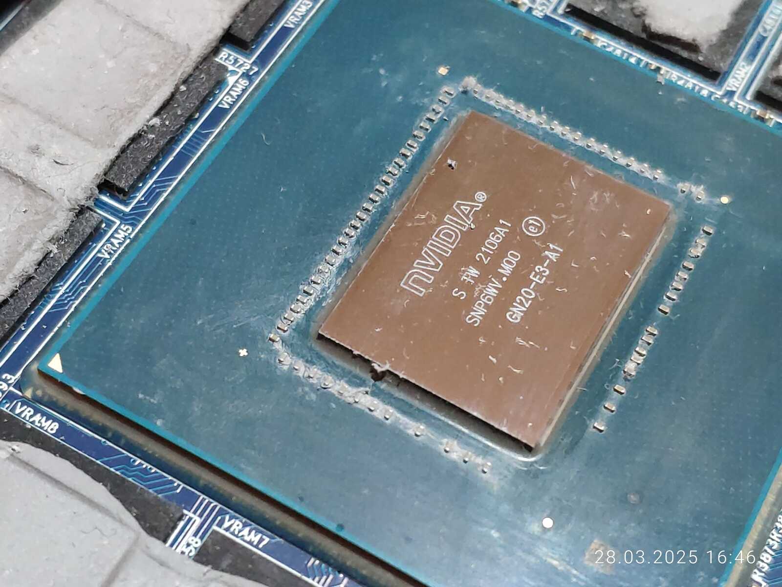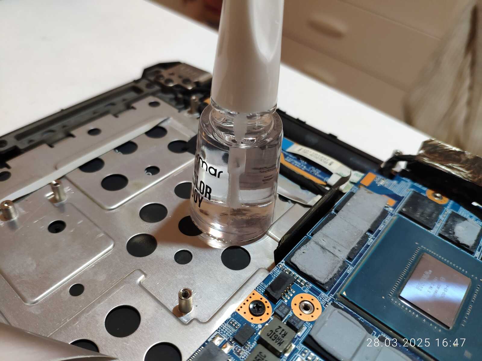 Меня сейчас напрягают маленькие конденсаторы на подложке ГП, потому вычищаю, беру лак для ногтей и заливаю конденсаторы толстым слоем, такое уже делал с видеокартой GTX 1070, и это уже проверенный временем способ защиты маленьких деталей на подложке от случайного повреждения.