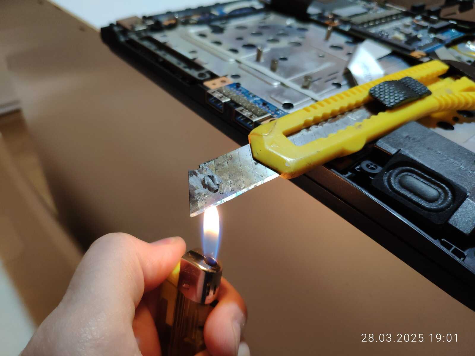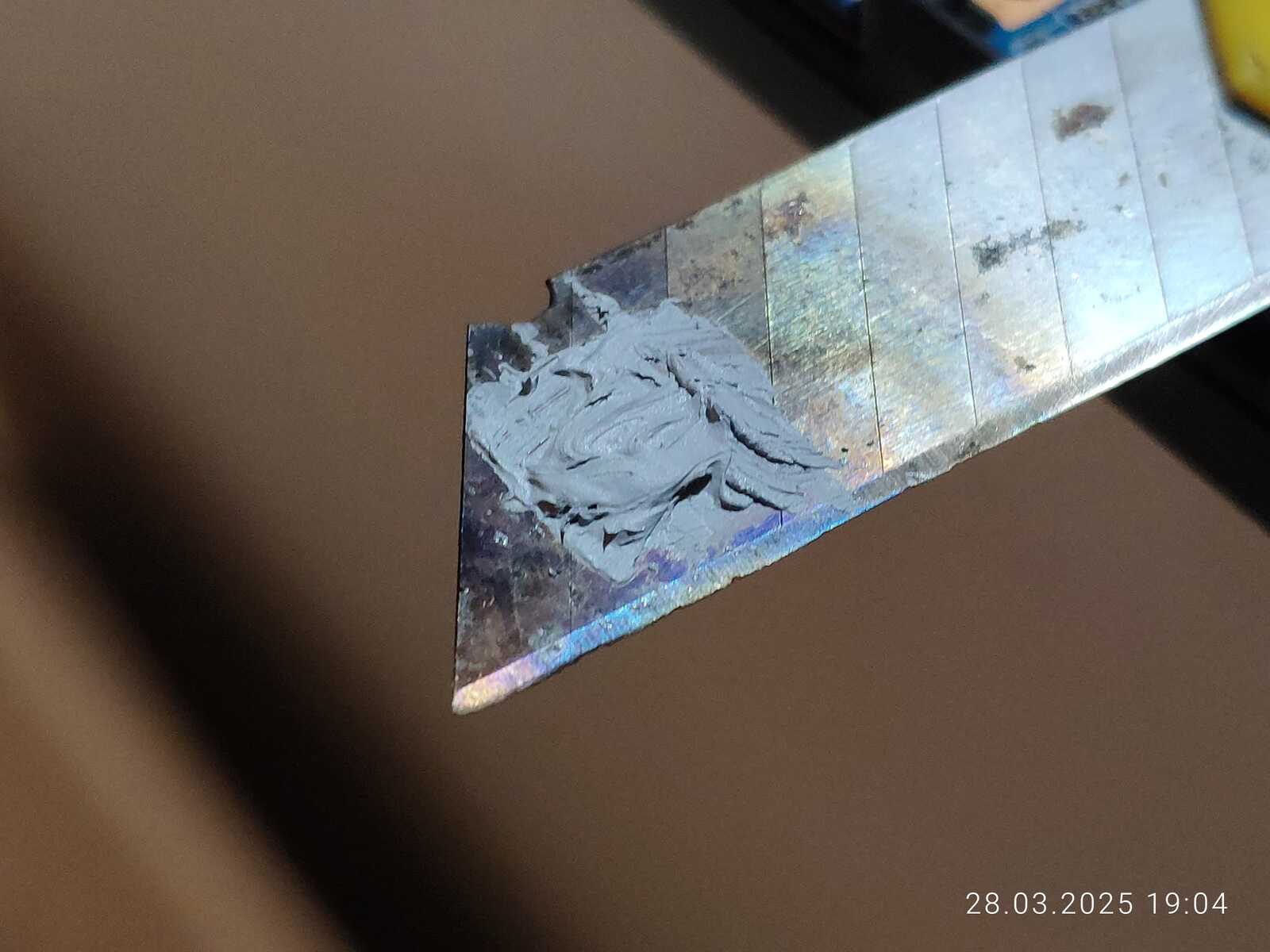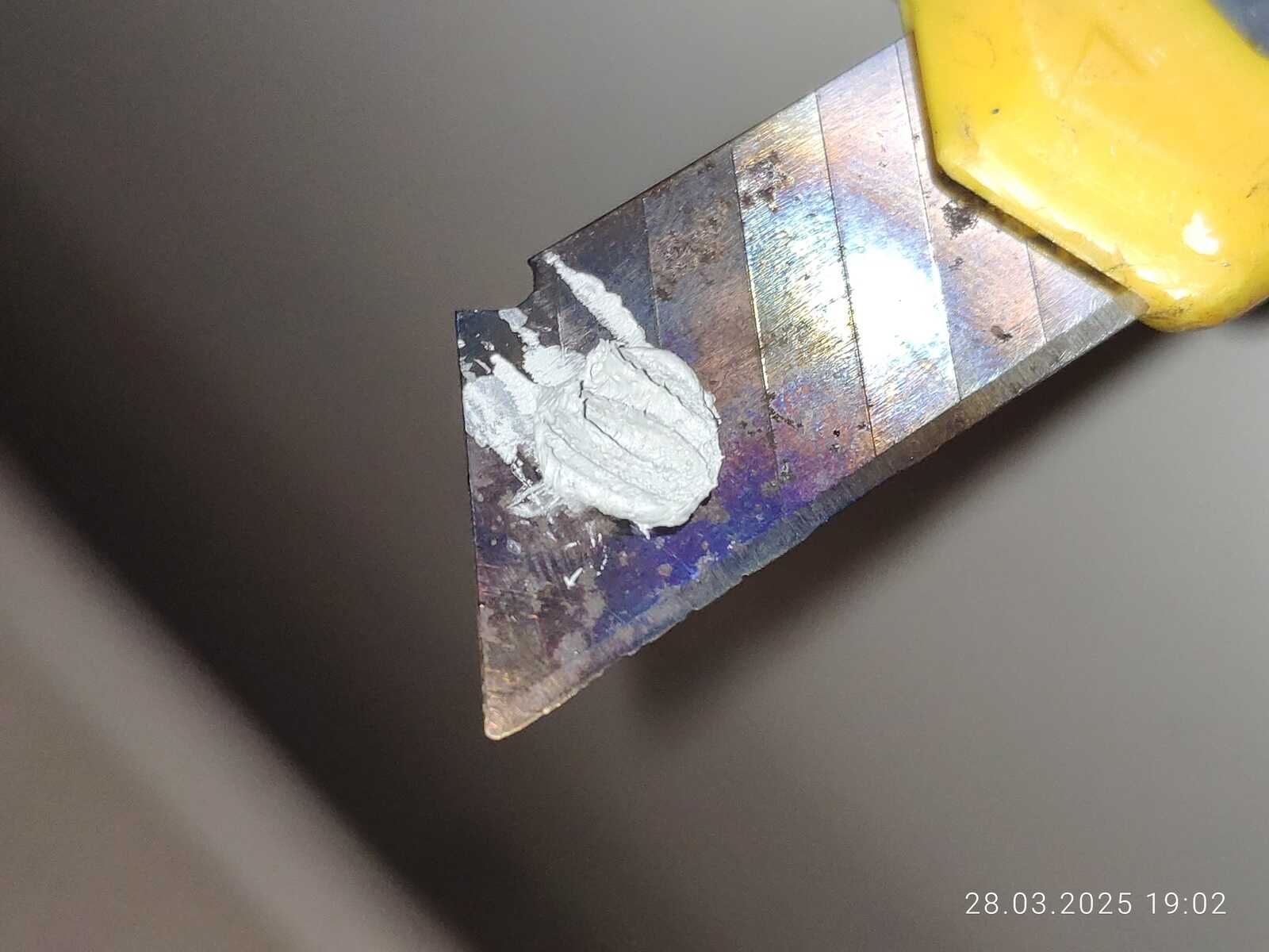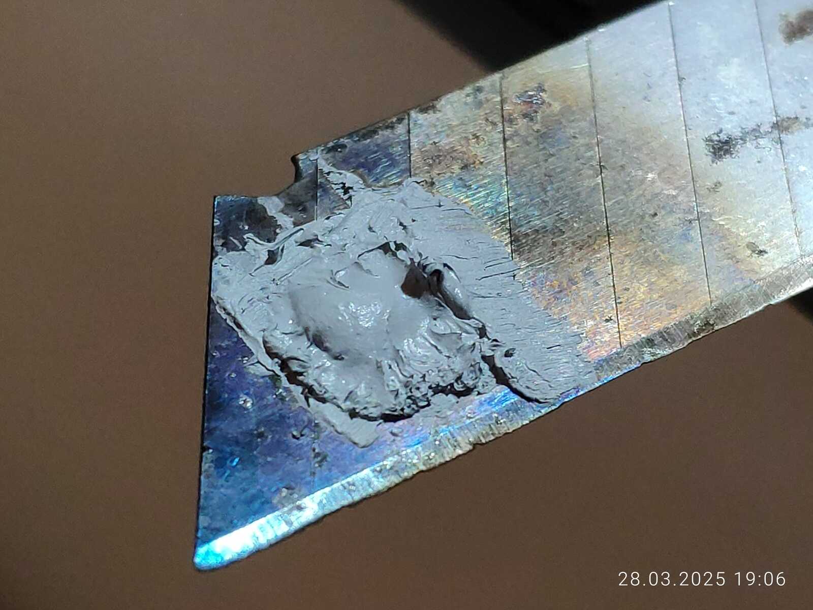 Беру значит использованную Maxtor CTG8, наношу на лезвие канцелярского ножа и грею зажигалкой, не забываем активно проветривать помещение, а ещё лучше делать на улице, таким простым методом выпариваю лишние наполнители, в горячем состоянии паста очень жидкая, но в холодном уже становится густой, очень густой, смотря сколько выпаривать.