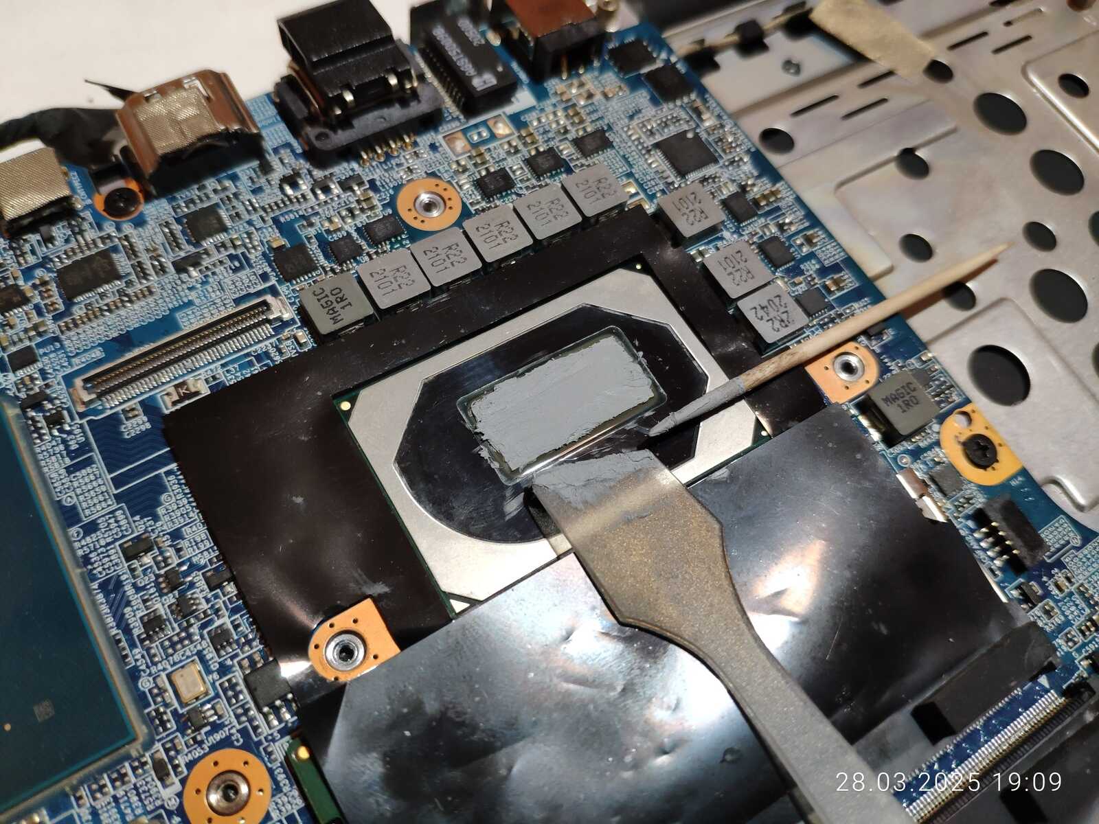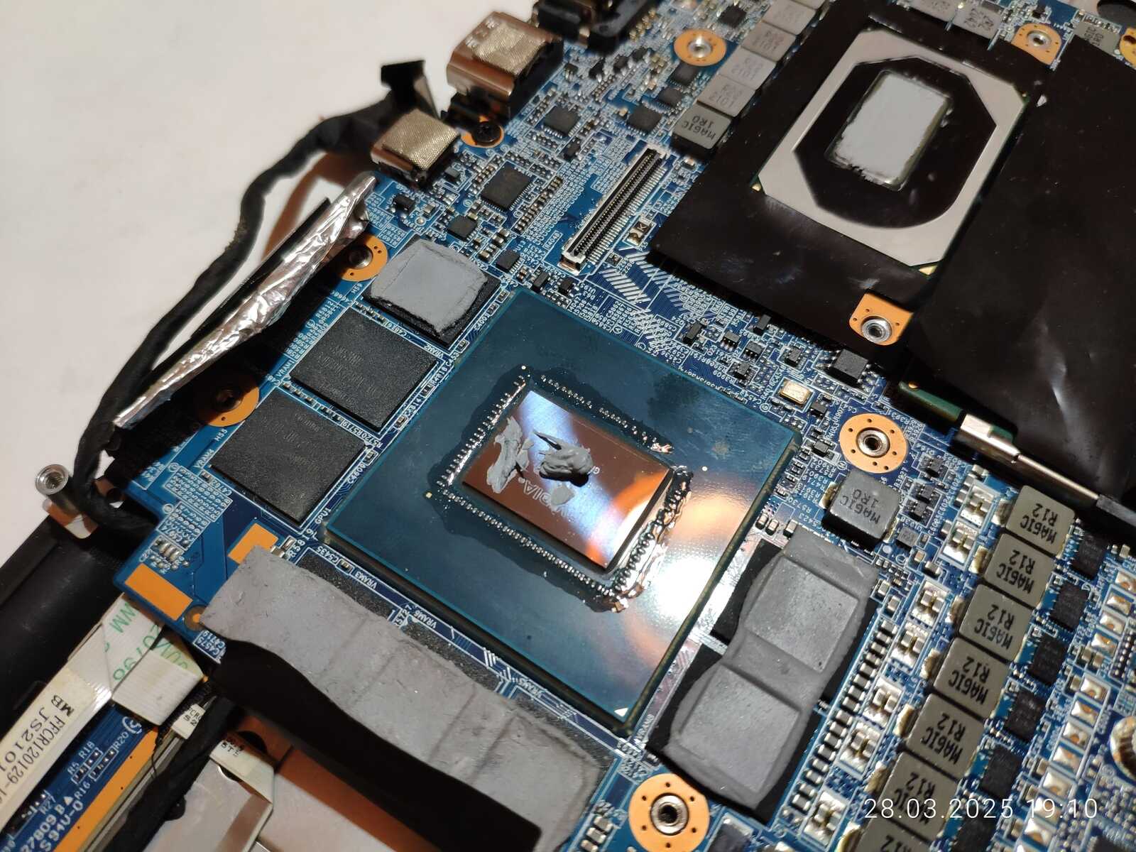 Ну а ещё пытался снять прокладки с чипов памяти, но решил оставить эту идею, ибо слишком тяжело снимаются, а на двух нижних чипах выглядит не очень мягкой, в любом случае я не хочу сейчас себе лишних проблем с прокладками, хотя и могу заменить выпаренной HY610 до очень густого состояния, так сказать сделать жидкие прокладки из обычной пасты, но такое не тестировал, так что неизвестно как поведёт себя при использовании...