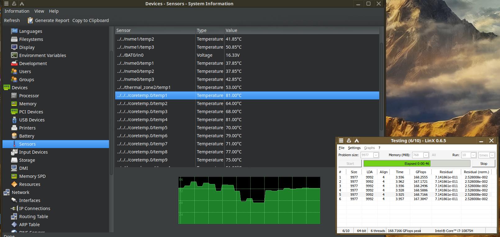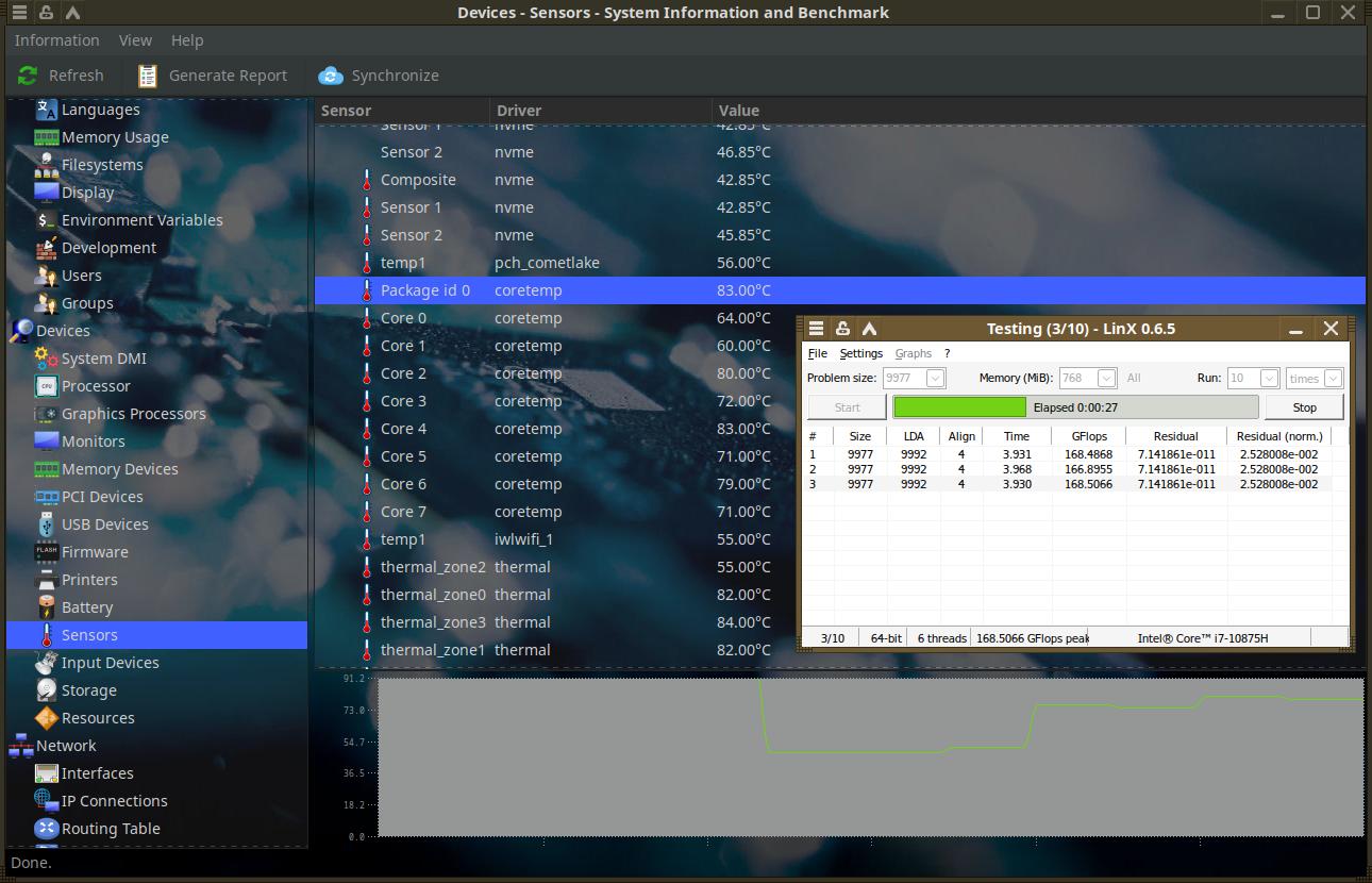 Так что начал экспериментировать с приложением Linx 0.6.5, но вот проблема, мне так и не удалось найти ни одного действительно адекватного приложения для Linux, которое бы умело строить адекватные графики температуры, HardInfo кое-как умеет делать, но это какой-то смех да и только.
