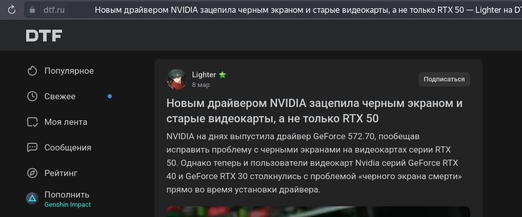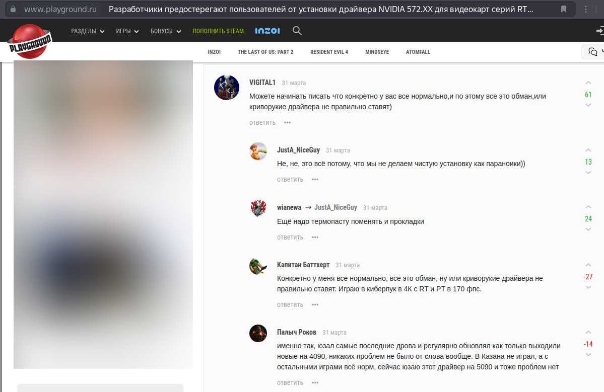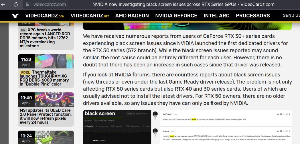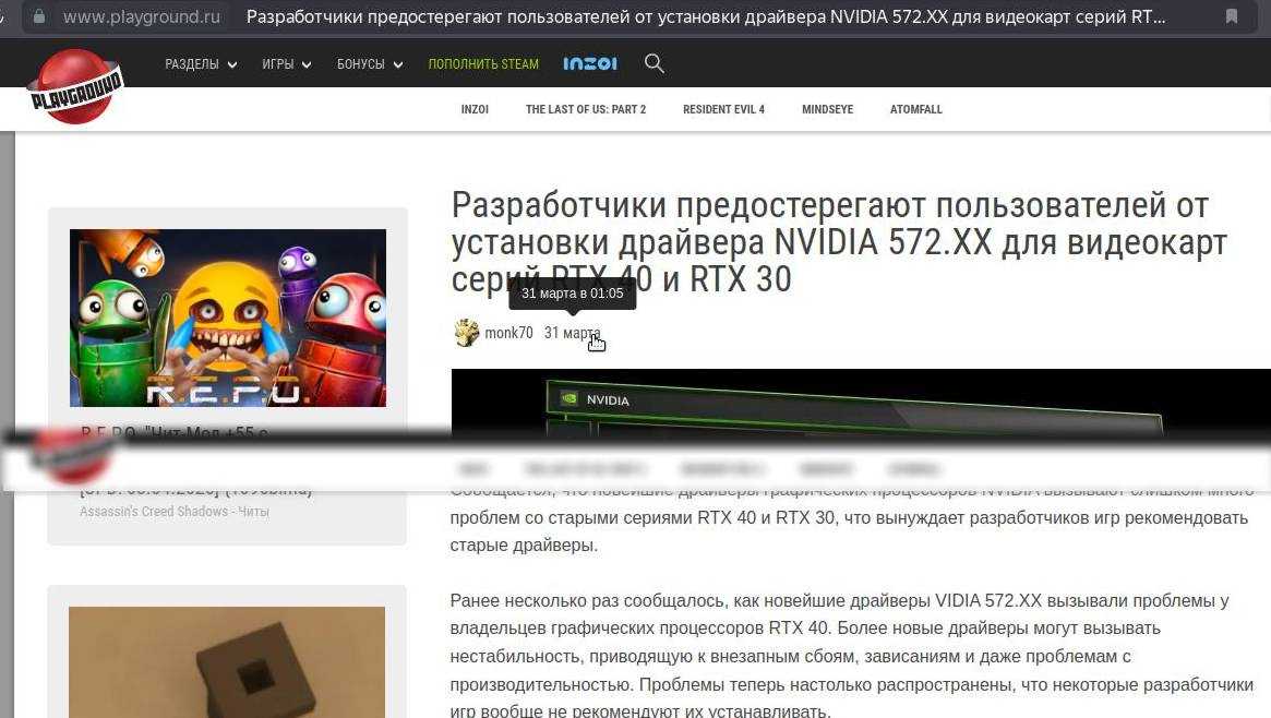 Первый найденный материал за 31 марта по данным поисковика говорит о большом количестве проблем на видеокартах серии RTX 3000 - 4000 во многих играх, внезапные сбои, зависания, артефакты и какое-то выпадение кадров (что?), и это всё за последние несколько месяцев (сейчас дата 2025-04-03), но стоит заметить, хоть поисковая система и пишет дату 31 марта, но на самом ресурсе уже указана дата 1 апреля, так что воспримем за шутку.