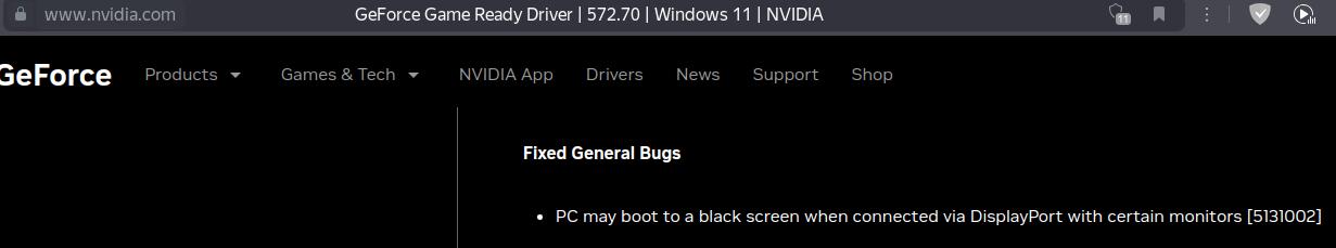 Хотя на сайте NVIDIA действительно указано исправление проблемы чёрного экрана при DP подключении дисплея, но там сказано про обычный чёрный экран при запуске, а не "чёрный экран смерти", да и находится эта "проблема" в разделе решённых, а говорят что она всё равно есть.