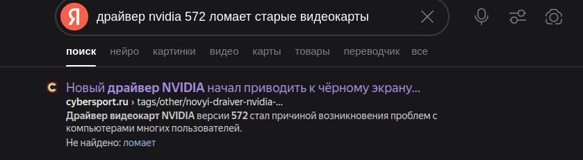 Да и в статье говорилось о других проблемах, например зависание драйвера при выходе из спящего режима, так что надо проверить. Опуская массу источников буквально идентичных первому рассмотренному, был найден ещё один, уже за 2025-02-21 число, и там сказано о проблеме чёрного экрана в ветке драйвера NVIDIA 572.xx.