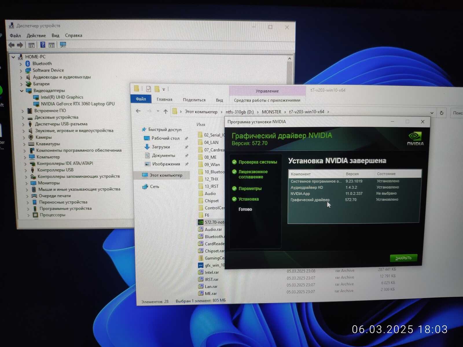 Сейчас же у меня ноутбук с RTX 3060, и когда я ещё даже понятия не имел о слухах, был установлен как раз тот самый драйвер NVIDIA версии 572.70, а ведь я просто скачал последний доступный и установил ни о чём не думая, как можно заметить, установка прошла абсолютно без проблем, хотя дисплей подключен как раз через DP, с которым якобы проблемы.