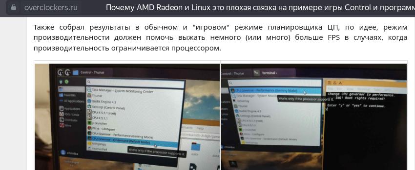 Как говорится - найдите разницу между обычным и производительным планировщиком, хотя у меня ещё запущен браузер сейчас и другие приложения, а процессор ограничен до 15 Вт и включена встроенная графика, из-за чего линуксоидный Mangohud оверлей поломался с показаниями объёма памяти и информацией о видеокарте, но не суть.
