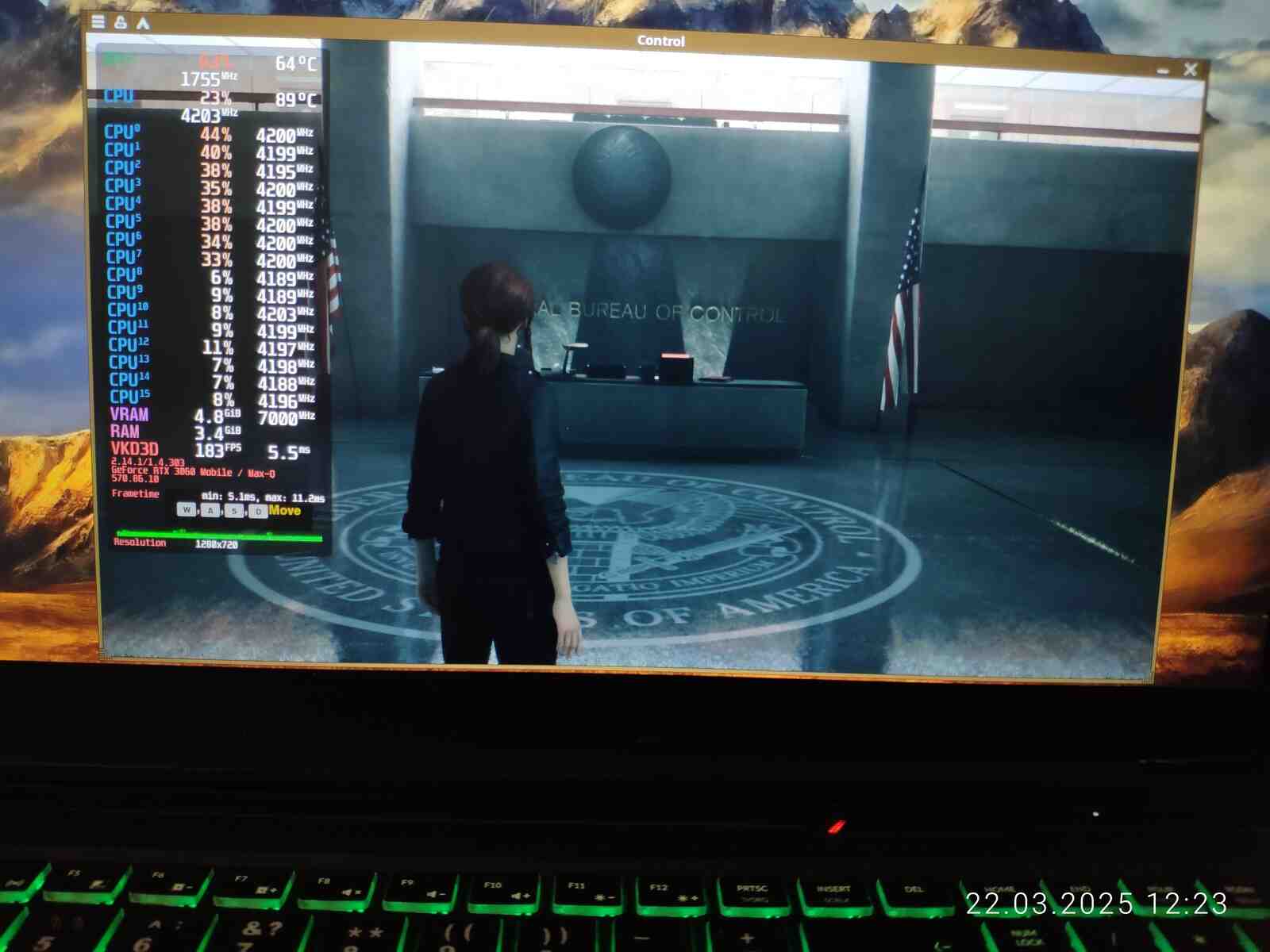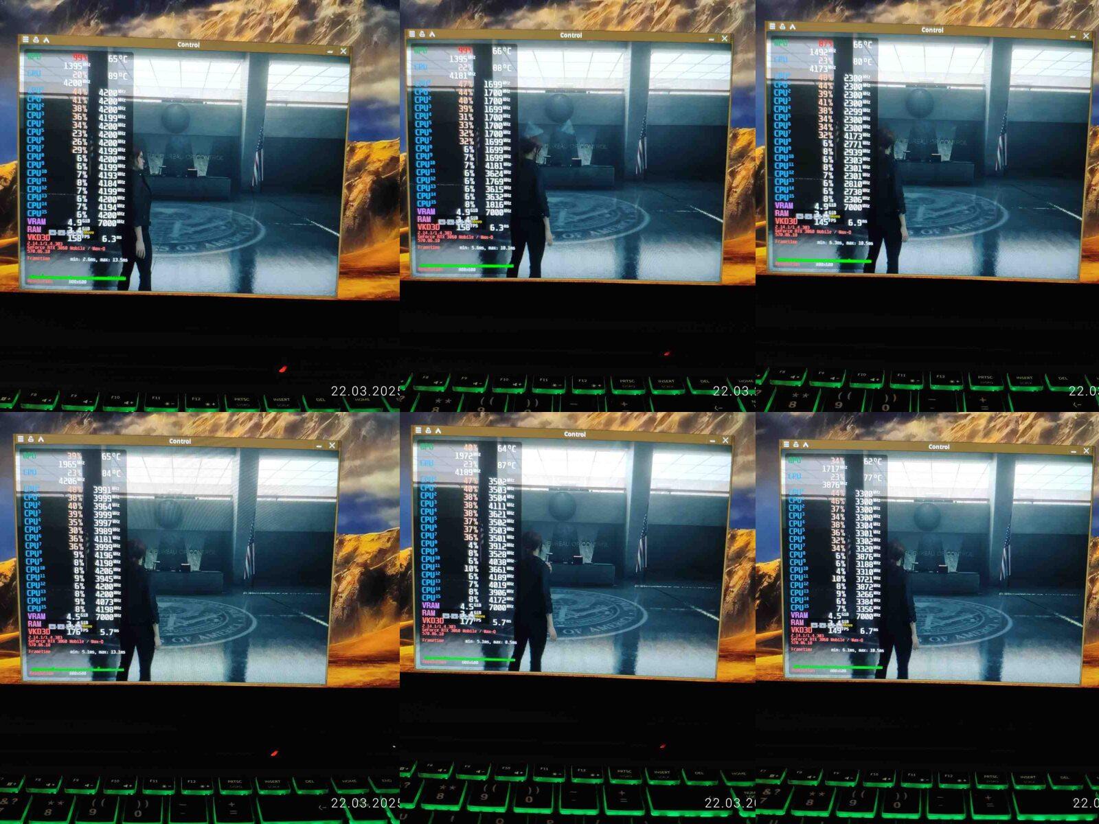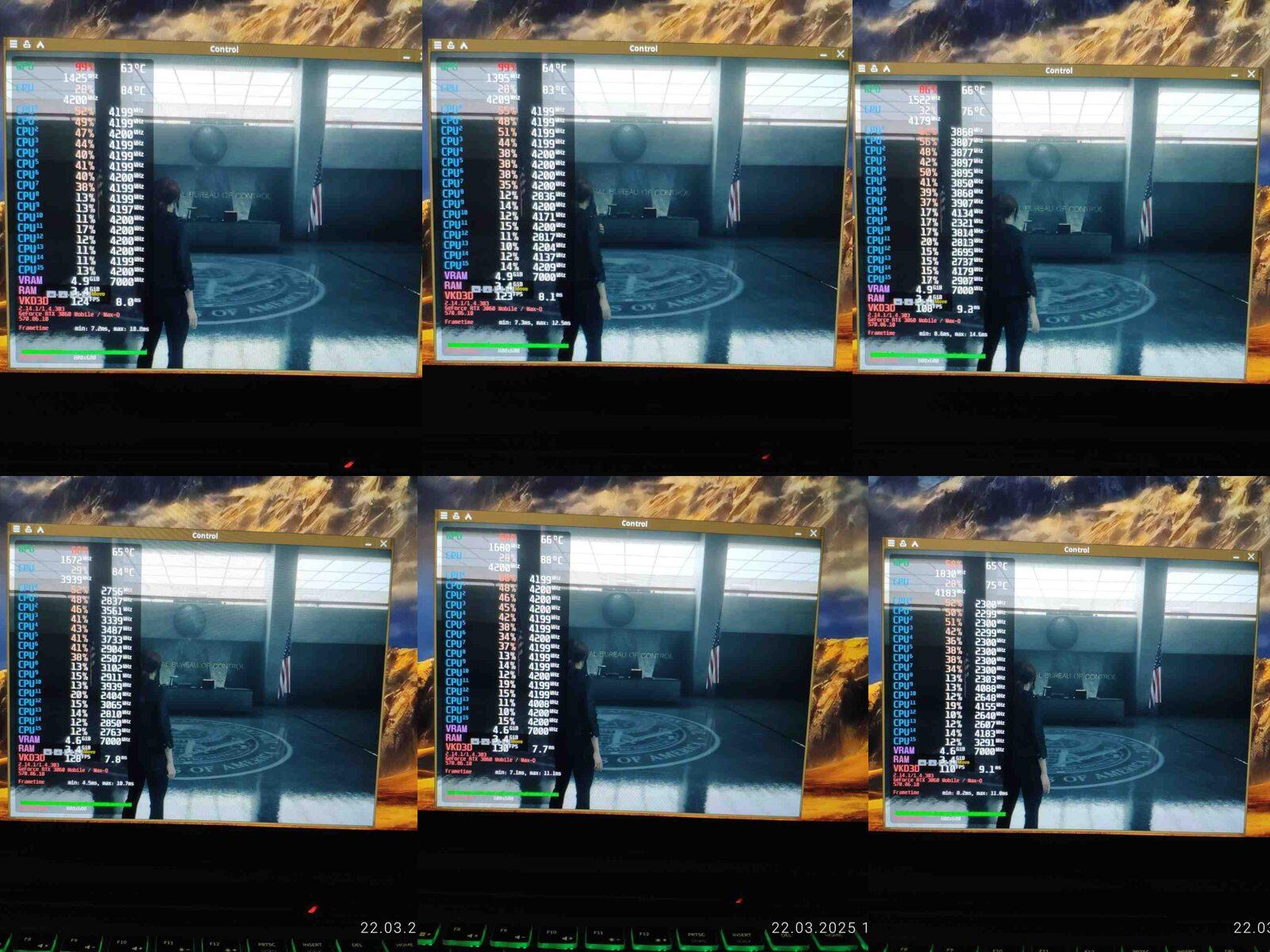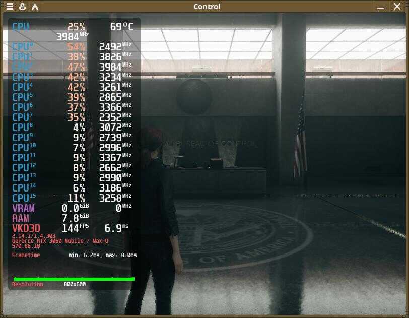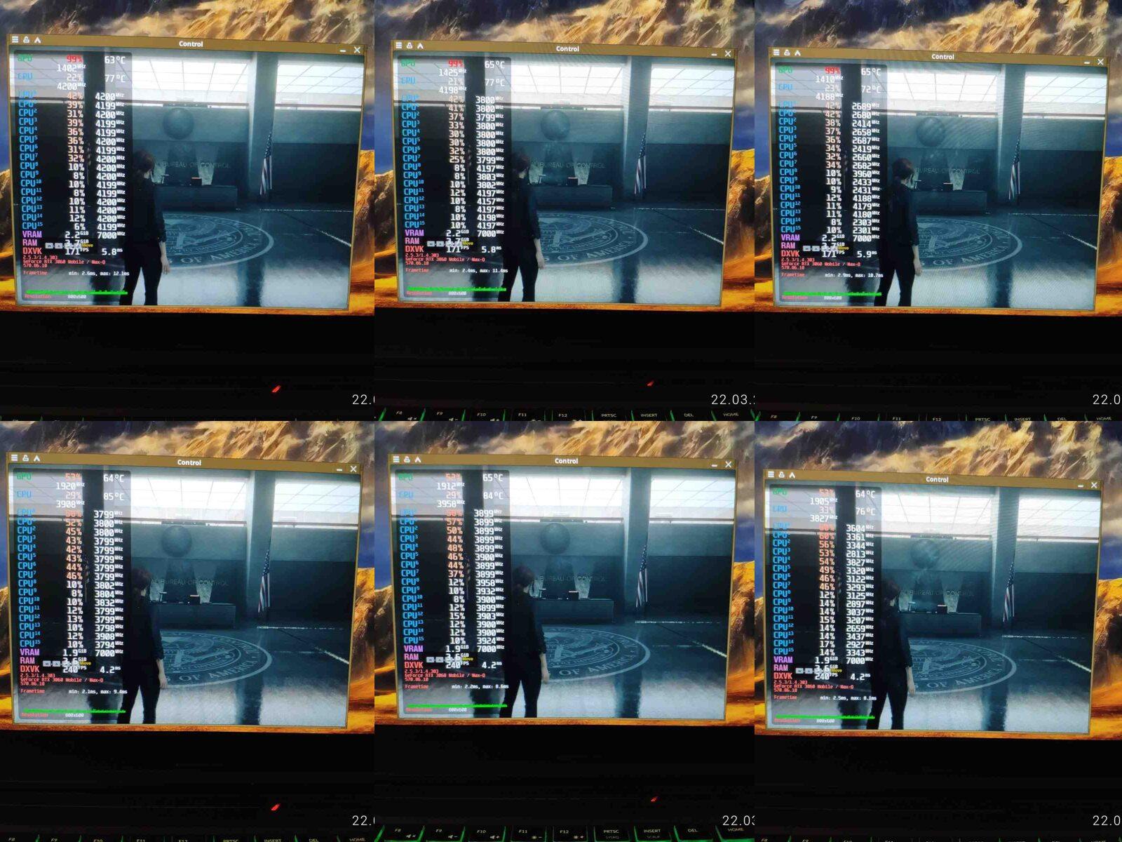И вот настал момент когда "новый" ноутбук был протестирован в игре Control, предыдущее "амуде" я проверял с разными планировщиками ЦП, это действительно влияло на производительность, ведь Ryzen 7 4800H архитектурно слишком слабый и недоразвитый процессор, чтобы без помощи операционной системы грамотно распределять нагрузку, но на Core i7-10875H я не буду проводить тесты с разными планировщиками в среде Linux, почему? Да потому что нет разницы, как показала практика - процессор от Intel хоть и старый, но прекрасно распределяет нагрузку на самые быстрые ядра даже при стандартном планировщике.