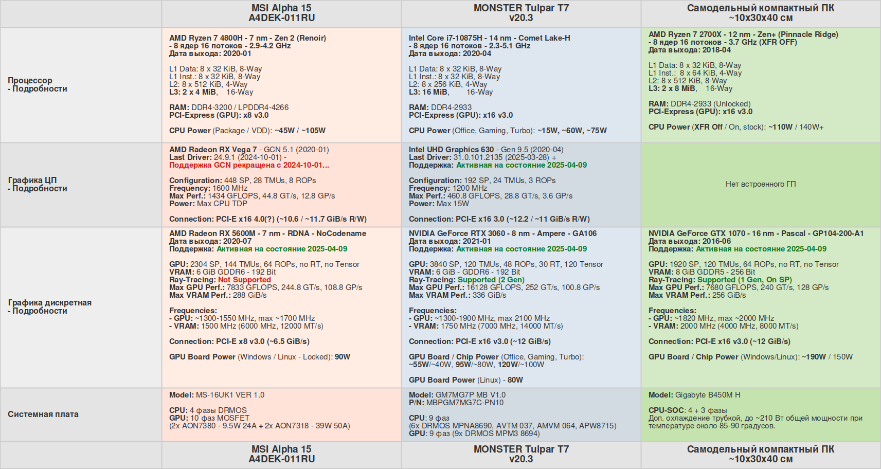Далее таблица с подробностями о процессорах и видеокартах.