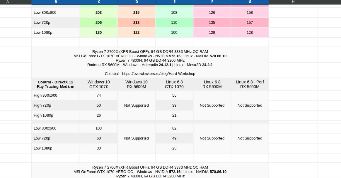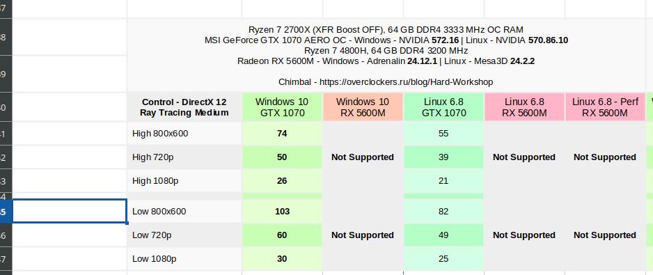 Причём есть интересный нюанс, на высоких настройках GTX 1070 и RX 5600M в среде Windows немного теряли FPS при переходе на DX 12, и видеокарта от AMD теряла сильнее, но RTX 3060 в режиме DX 12 показала более высокий FPS, неужели это разница в версии драйвера (572.16 и 572.70)? Или может RTX 3000 серии просто лучше работают с данным API, не совсем понятно, без целенаправленных тестов сложно сказать...