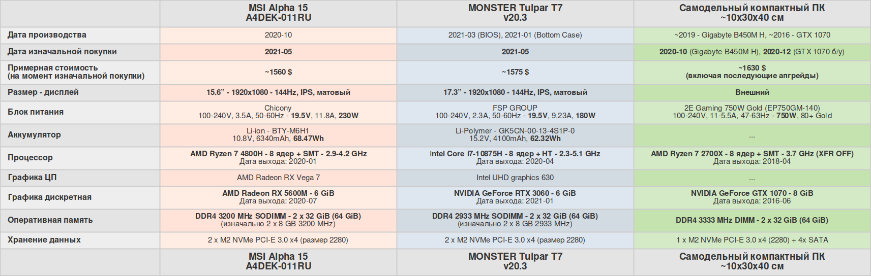В сравнении будет участвовать два ноутбука и компактный ПК, просто потому что уже есть результаты для сравнения, все конфигурации добавлены в одну таблицу, единственная проблема это расчёт стоимости компактного ПК... У меня в одной статье была указана примерная стоимость на уровне ~1030$, но ведь со временем сломался БП из-за бракованных конденсаторов, пришлось купить новый и заменить, да и R5 1600 был заменён на R7 2700X, как и мизерные 16 ГиБ ОЗУ были увеличены до 64 ГиБ, так что докинем это всё в общую примерную стоимость не исключая ранее затраченные деньги на сборку.