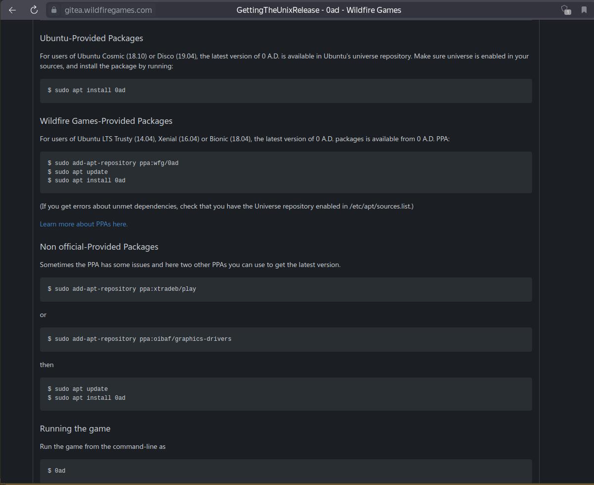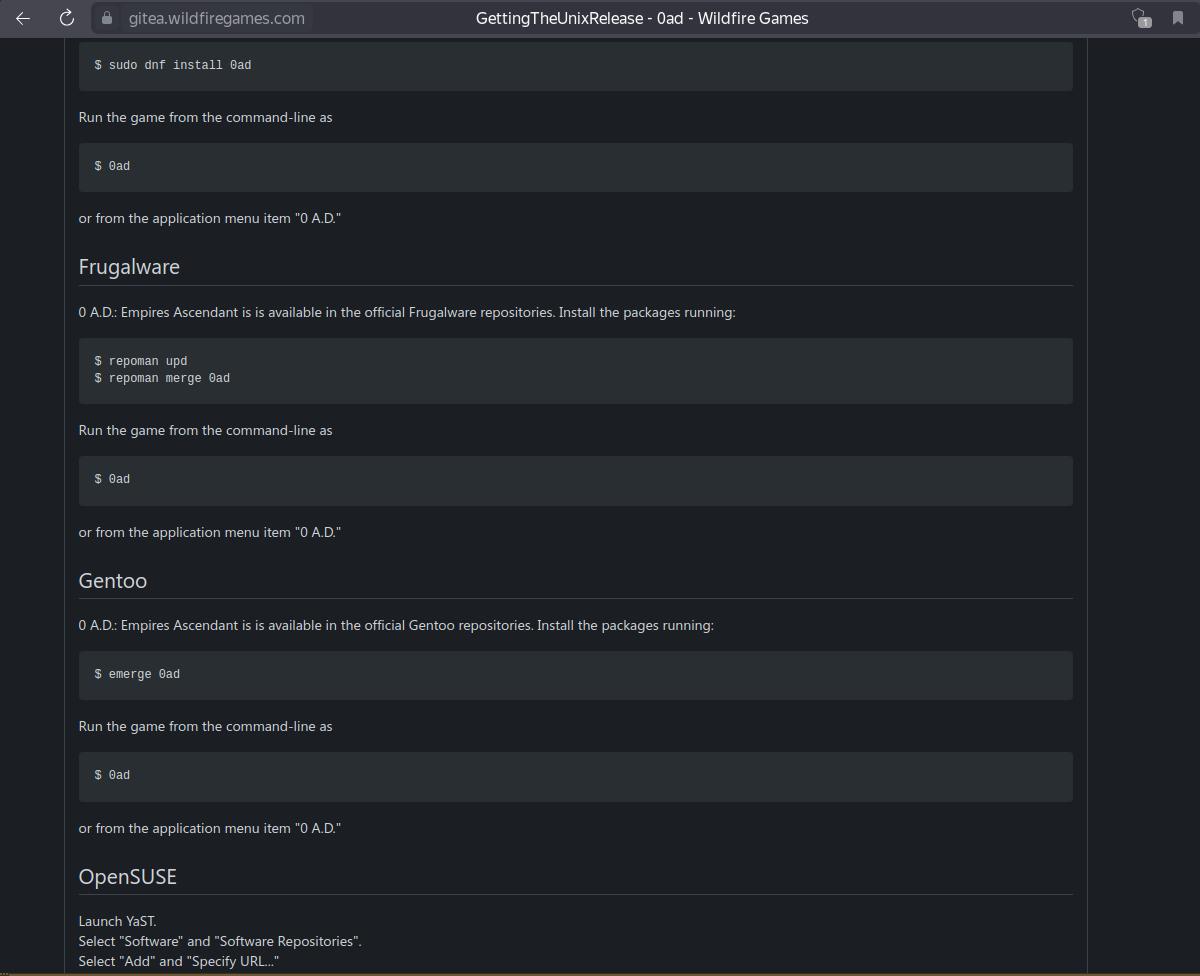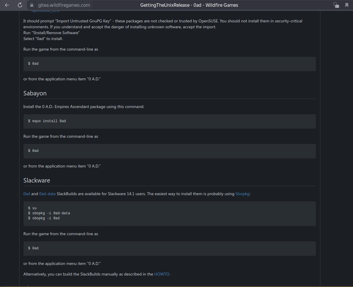 Теперь я могу в любой момент взять установочный пакет с игрой 0 A.D., и установить где хочу, когда хочу, и даже на компьютерах без доступа к интернету, достаточно просто запустить установочный пакет, несколько раз подтвердить установку, и готово, причём установка происходит в специально отведённый каталог, и не требуется root прав при этом.
