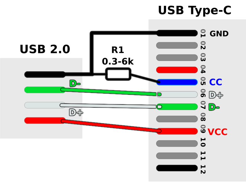 В итоге я набросал простую схему переходника с USB 2.0 на USB Type-C, контакт GND соединяется напрямую, как и VCC 5V, а вот с контактами DATA+ и DATA- ситуация немного сложнее, нужно D+ от устройства подключать к D- гнезду Type-C, собственно это единственный нюанс, причём не критичный, ничего страшного не произойдёт, если перепутать контакты данных. Ну и конечно резистор между GND и CC, без него ничего не будет работать, у меня было два резистора по 10 кОм соединённых параллельно, то есть в моём случае сопротивление резистора около 5 кОм, но можно и другие подручные номиналы применять.