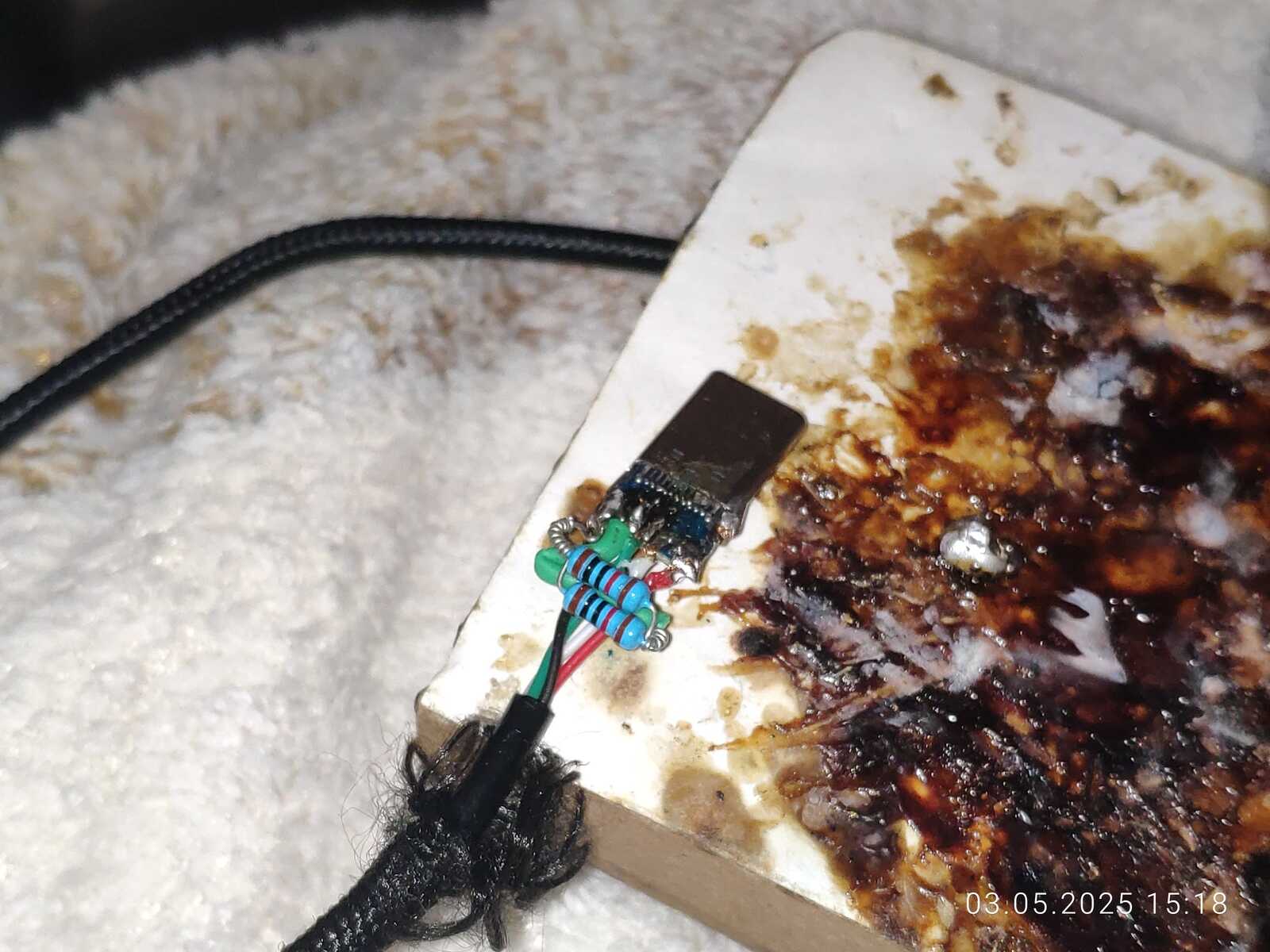 Так или иначе это уже не важно, основная задача состояла в том, чтобы переделать мышь из обычной USB 2.0 в Type-C, и эта задача прекрасно выполнена. На самом деле не было ничего сложного, просто припаять несколько проводов с резистором в нужные места.