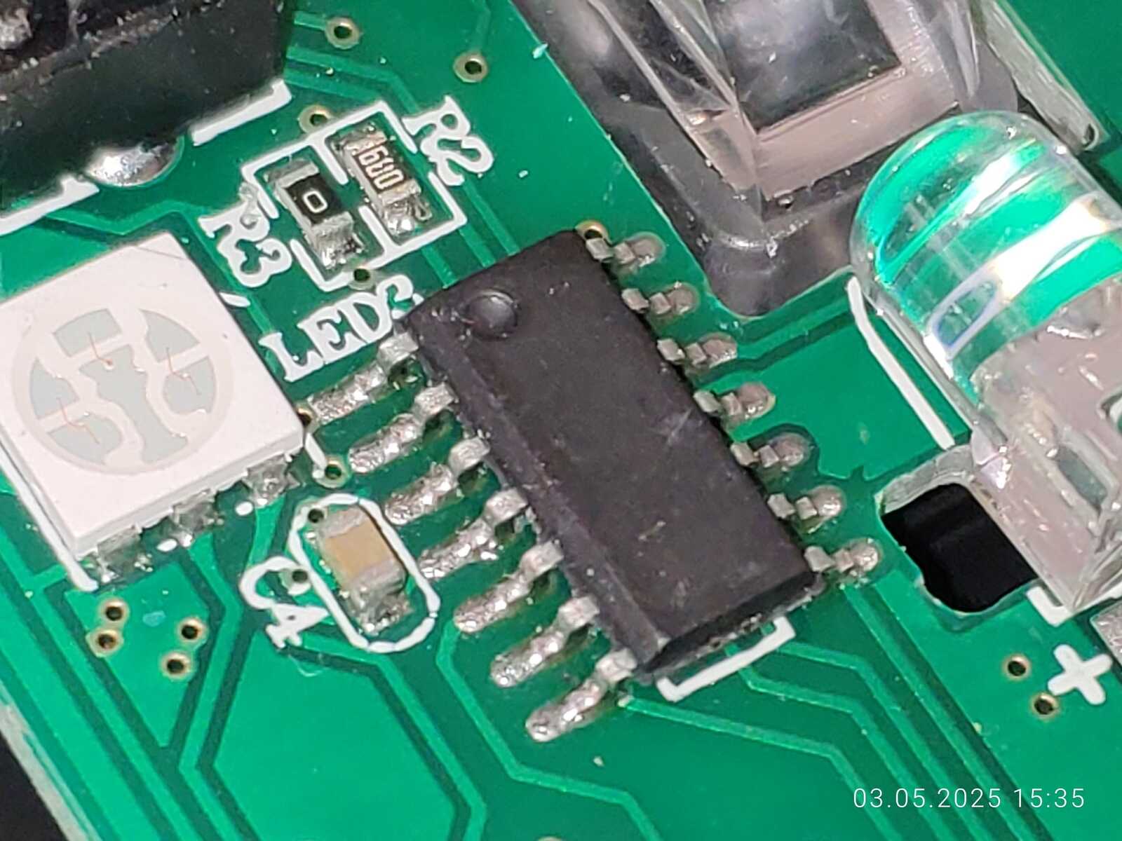 Одна микросхема со стёртой маркировкой, производитель вероятно не чист на руку. Сенсор A603EP, вполне хороший сенсор, реагирует на незначительные движения, позволяет перемещать курсор с точностью до одного пикселя, не каждый на такое способен, при отрыве от поверхности никуда не уносит.