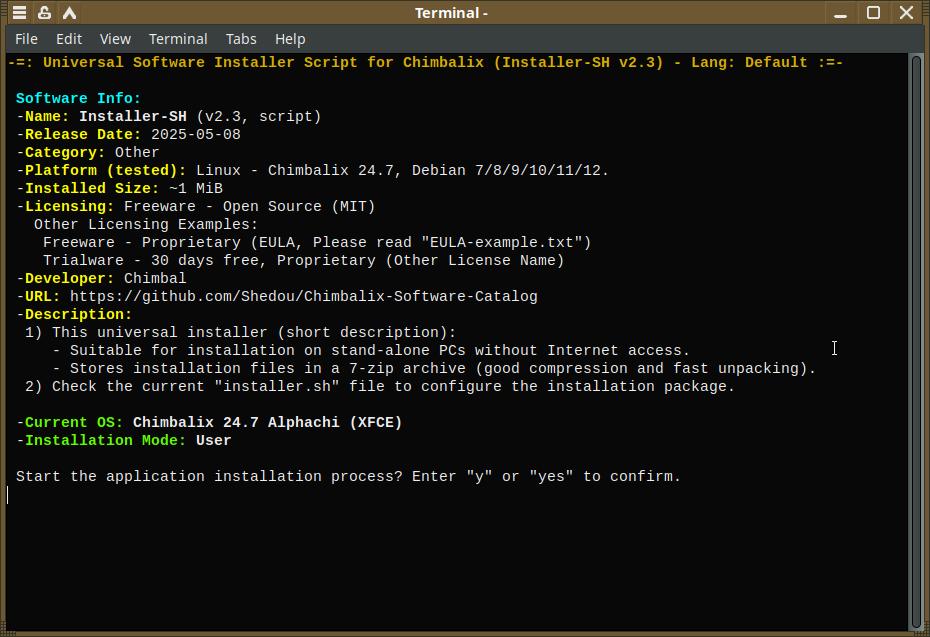 Installer-SH это автономный установочный пакет приложений для Linux, в первую очередь предназначен для дистрибутива Chimbalix, однако способен работать и в прочих линуксах, далее речь пойдёт про Installer-SH версии 2.3, актуальная на текущий момент.