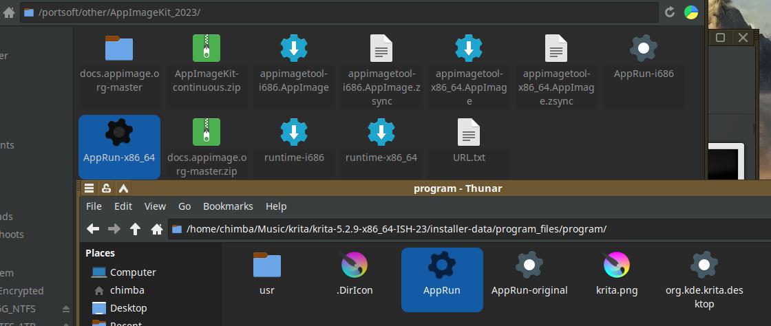 Так как разработчики Krita используют кривой файл AppRun с давних времён, непригодный для использования в распакованном виде, я беру оригинальный файл из AppImageKit, с ним программа отлично работает, да, вот такие нюансы иногда приходится учитывать при перепаковке софта из линуксоидных форматов.