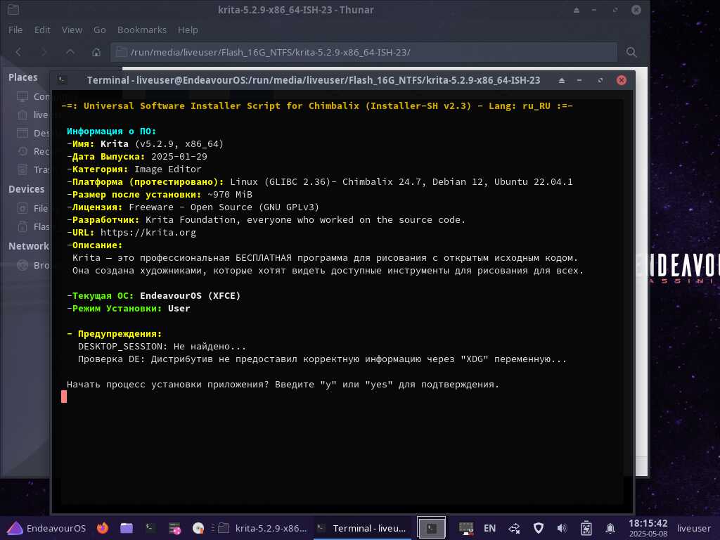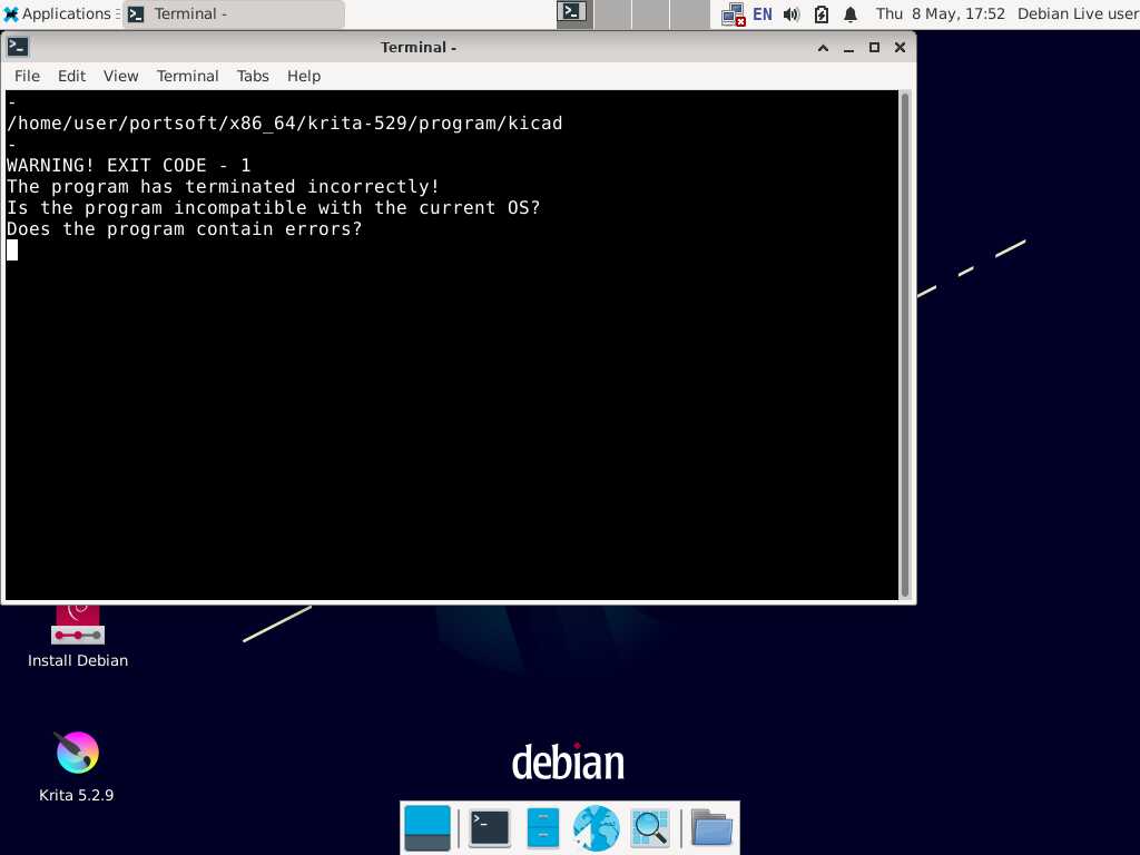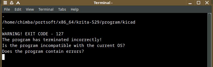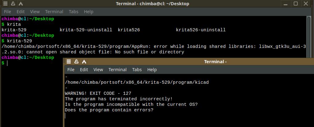А теперь спровоцируем ошибочную ситуацию, когда пользователь устанавливает программу в линуксе, с которым программа не дружит, мягко говоря. Давайте подменим исполняемый файл, я специально взял погрязший в зависимостях DEB пакет программы KiKad, извлёк бинарник и подставил его вместо Krita.