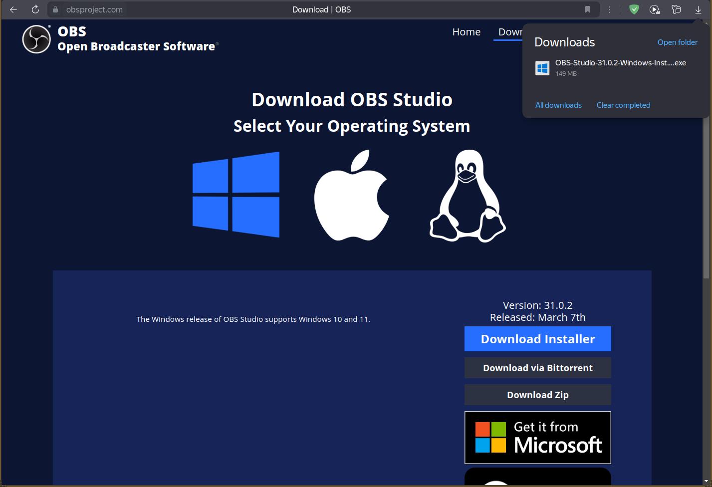Ну что же, давайте прямо в лоб, зайдём на официальный сайт проекта OBS Studio и скачаем установочный файл! Для Windows указаны системные требования, скудно, но сойдёт, и просто предоставляют установочный exe-файл, всё элементарно и понятно. Аналогичным образом сделано и для MacOS, вообще никаких проблем.