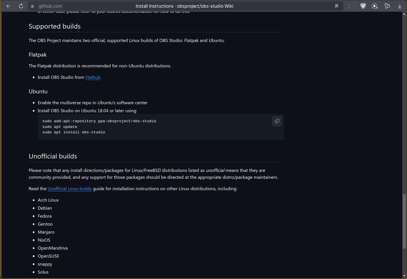 Может, метод установки из официальных линуксоидных репозиториев мне, пользователю, поможет? Нет! Простыня каких-то заклинаний для терминала и требований к зависимостям, и не факт, что всё заработает по инструкциям! Мусорный вариант Flatpak вообще не годится, ибо уже сказано про него выше.