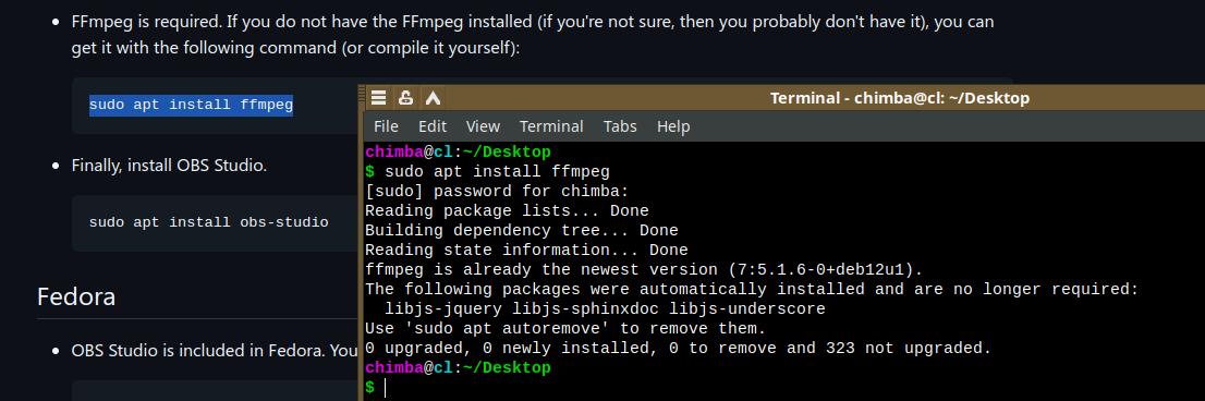 Что там, обновить списки репозиториев и установить ffmpeg? Отлично, у меня уже установлен.
