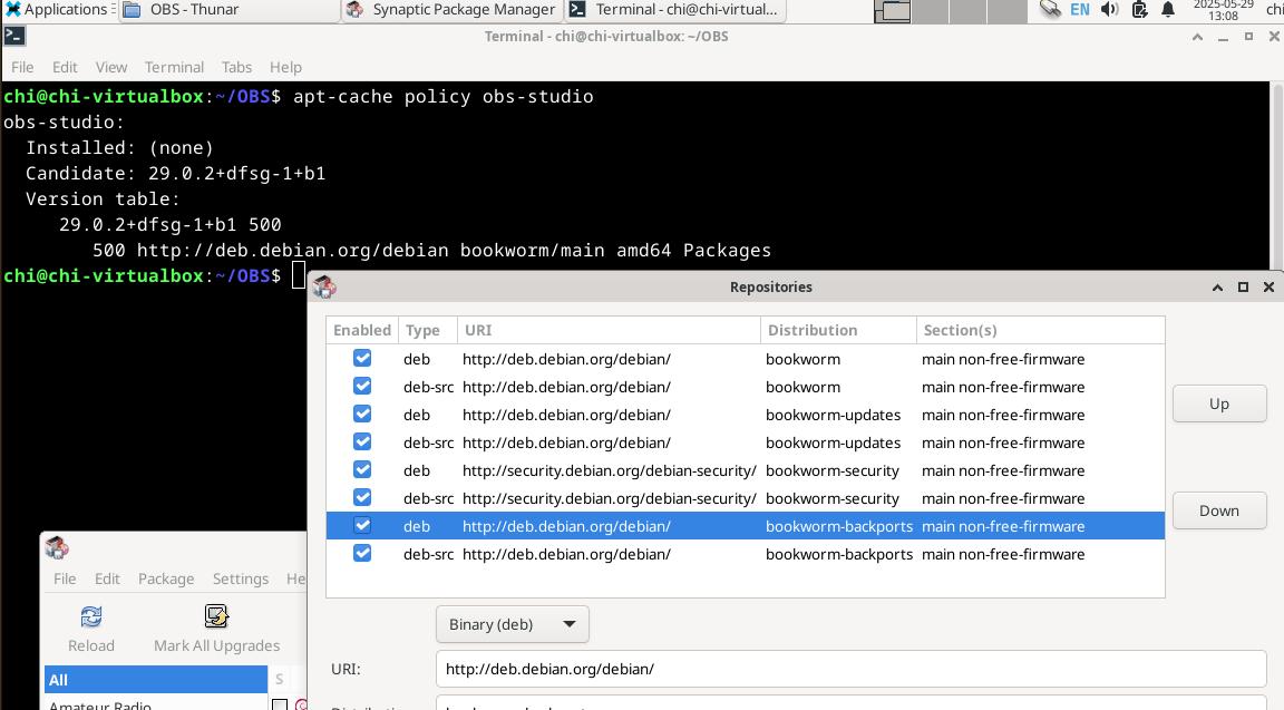 Кстати, там, вижу, подключен «backports» репозиторий в чистом Debian 12, может, свежий OBS Studio будет? Ага, конечно, такой же засохлый 29-й версии нашёлся, когда актуальная 31-я версия, а ведь линуксоиды очень любят рассказывать сказки неопытным людям, мол, подключи backports репозиторий и обновляй себе софт...