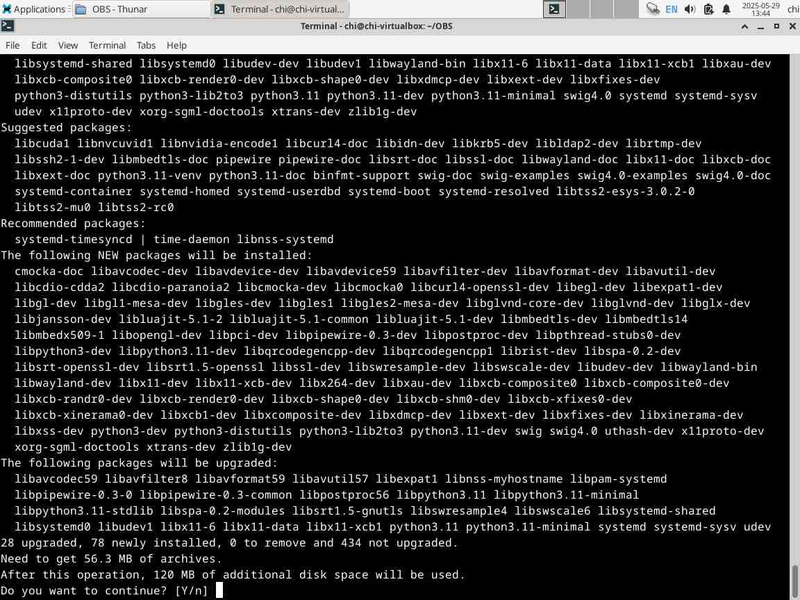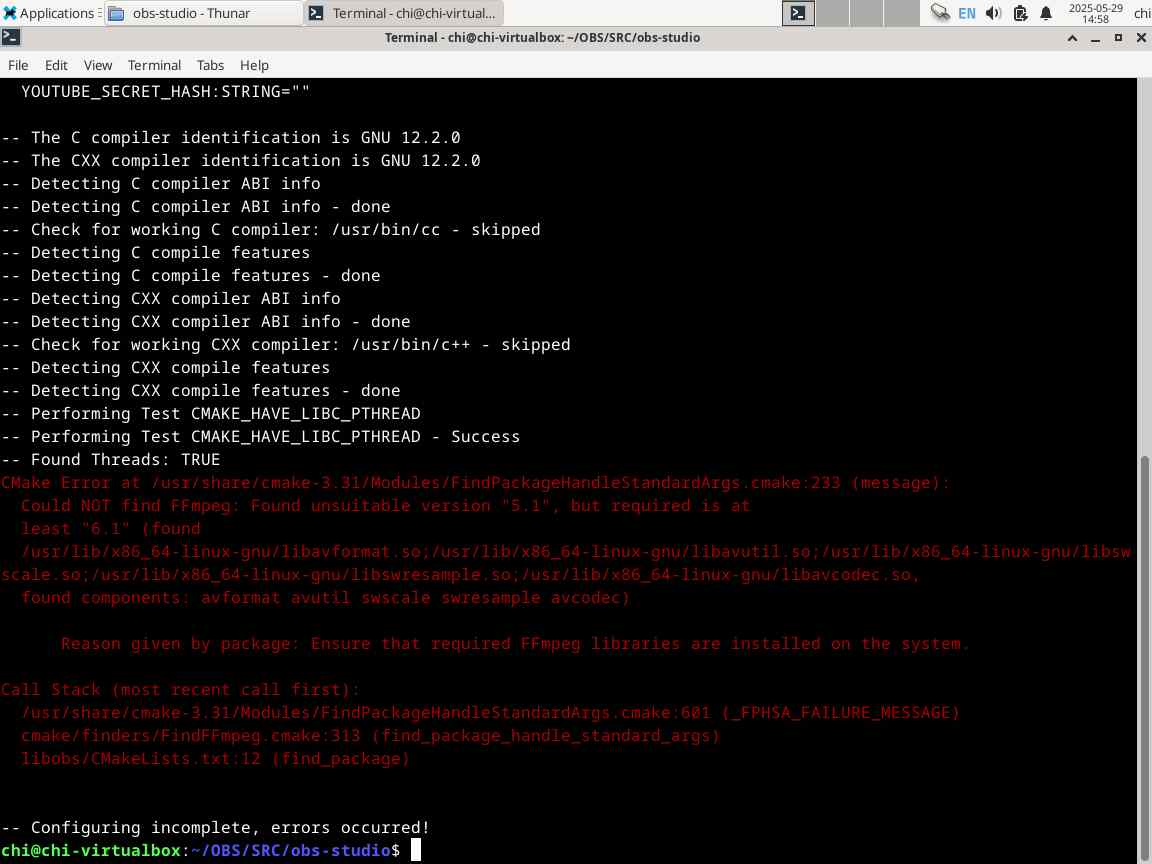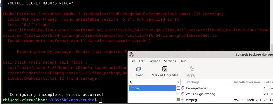 А вот и нет, конфигурация обрывается на версии ffmpeg, нужна версия 6.1, а в наличии только 5.1, и дальше никак, всё, скомпилировали поделку для Linux из исходного кода под названием OBS Studio...