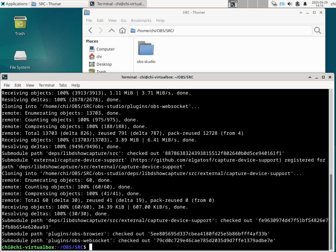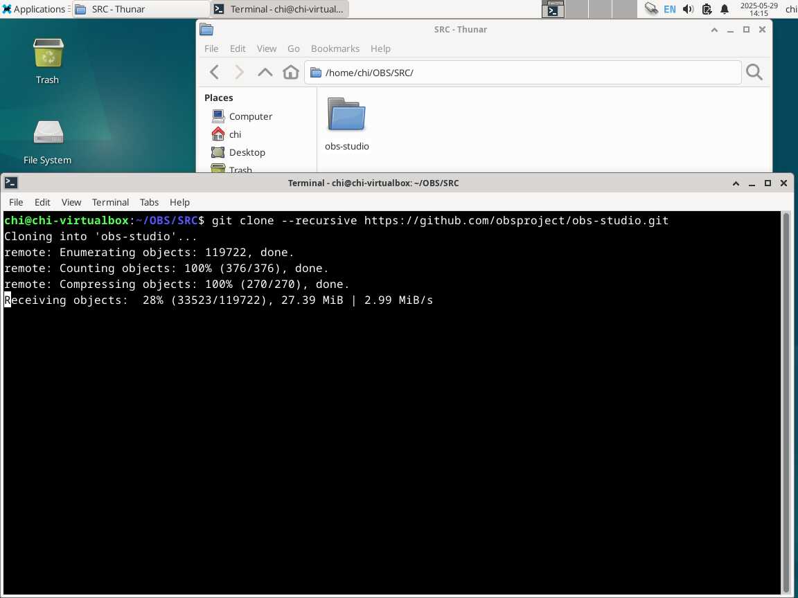 Теперь клонирую репозиторий OBS Studio, как в инструкции, заодно архивирую папку, это будет резервная копия, чтобы заново всё не скачивать при любом спотыкании на ровном месте, а таких спотыканий будет очень много у обычных пользователей, попытавшихся собрать нужное приложение под Linux, ввиду отсутствия адекватных установочных файлов, пригодных для распространения и использования.