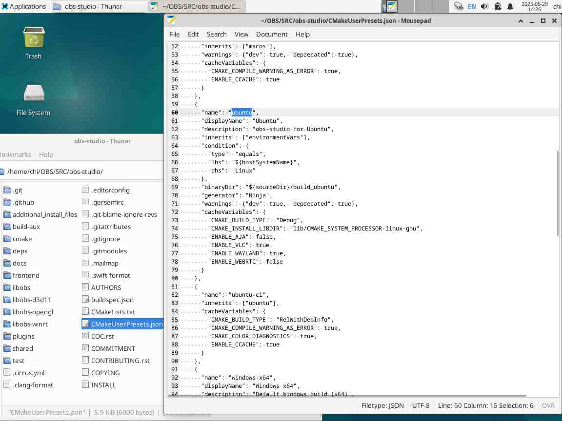 Одно радует, с исходным кодом есть файл «CMakePresets.json», и там есть профиль «ubuntu», его и будем настраивать, но сначала переименуем файл в «CMakeUserPresets.json», чтобы было всё по инструкции.