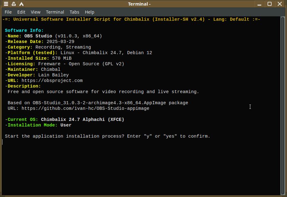 По традиции выкладываю созданный установочный пакет OBS Studio 31.0.3 в репозитории Chimbalix-Software-Catalog, вдруг кому-то пригодится.