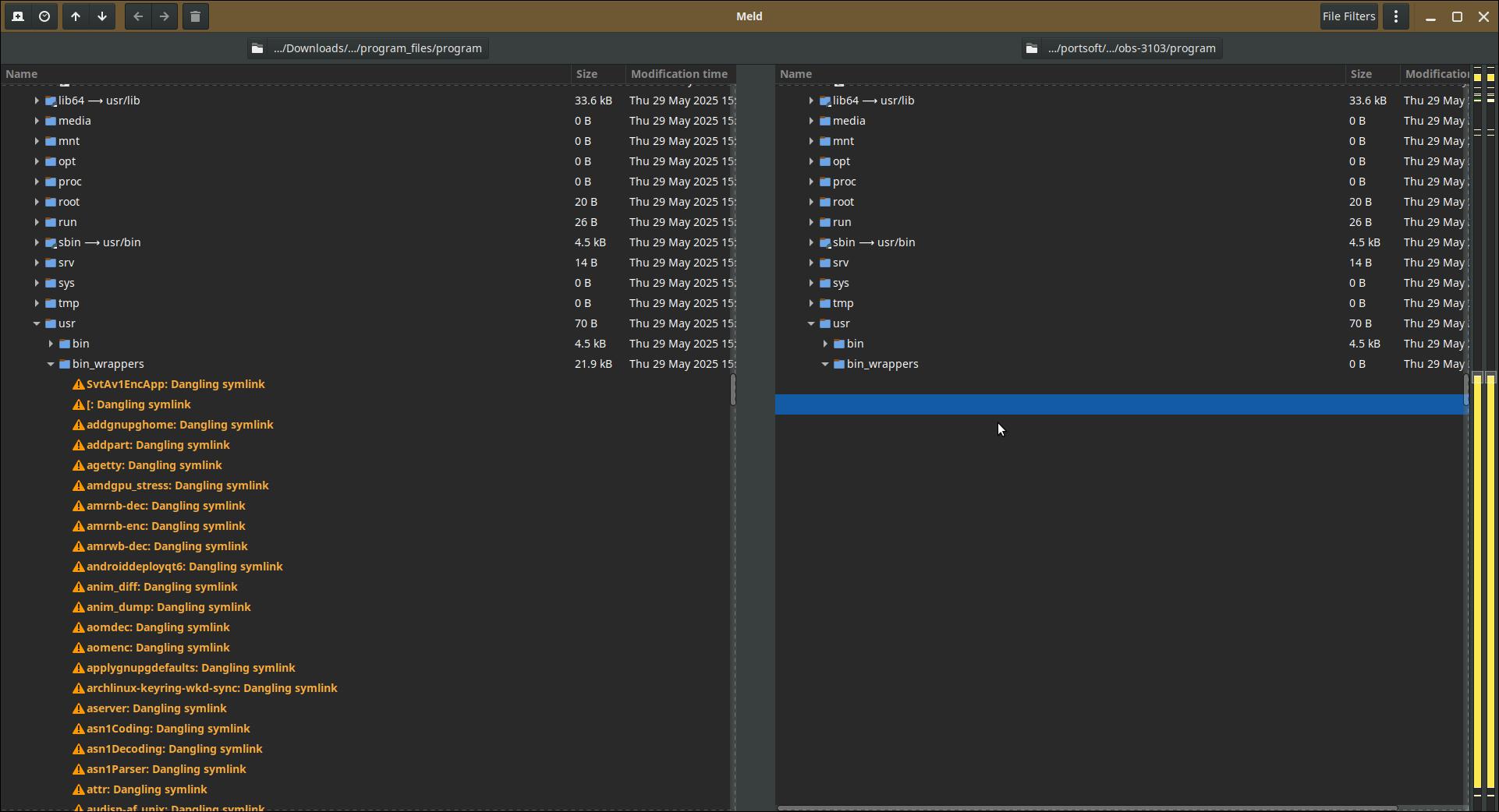 И да, проблема в символических ссылках, некоторые потерялись, архиватор 7-Zip их посчитал опасными при распаковке, те самые ссылки с абсолютными путями, и даже -snld параметр не помогает...