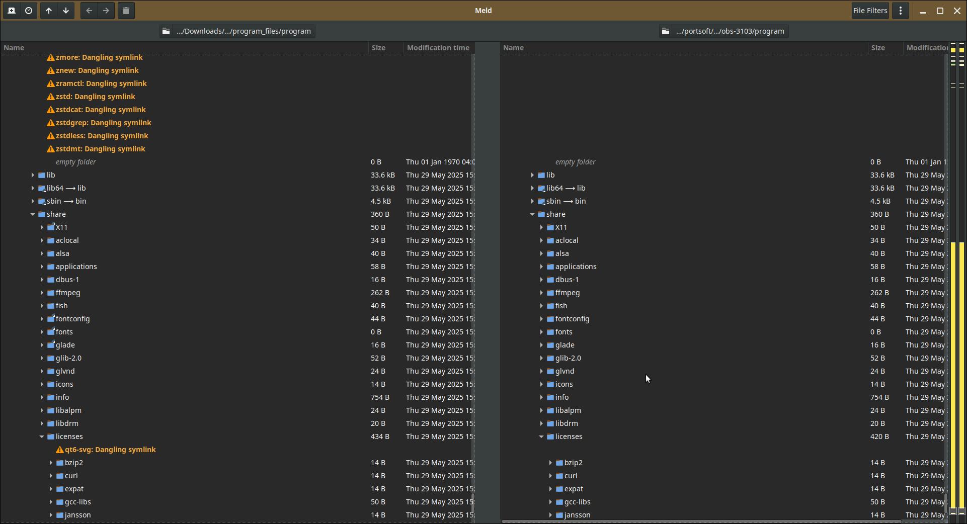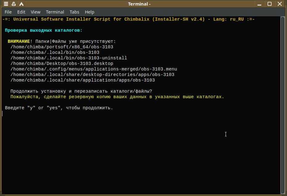 Впрочем, раз уж работает и без «опасных» символических ссылок, а кривые можно руками подправить, то можно так и оставить всё, но только на время, ведь есть ссылки, удаление которых явно нежелательно, короче, ещё вернёмся к этому вопросу... Сейчас есть другая проблема, OBS Studio всегда закрывается с ошибкой, и прослойка от Installer-SH это ловит, причём даже в оригинальном виде «как есть», со всем набором битых ссылок.