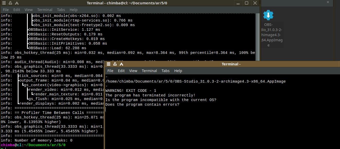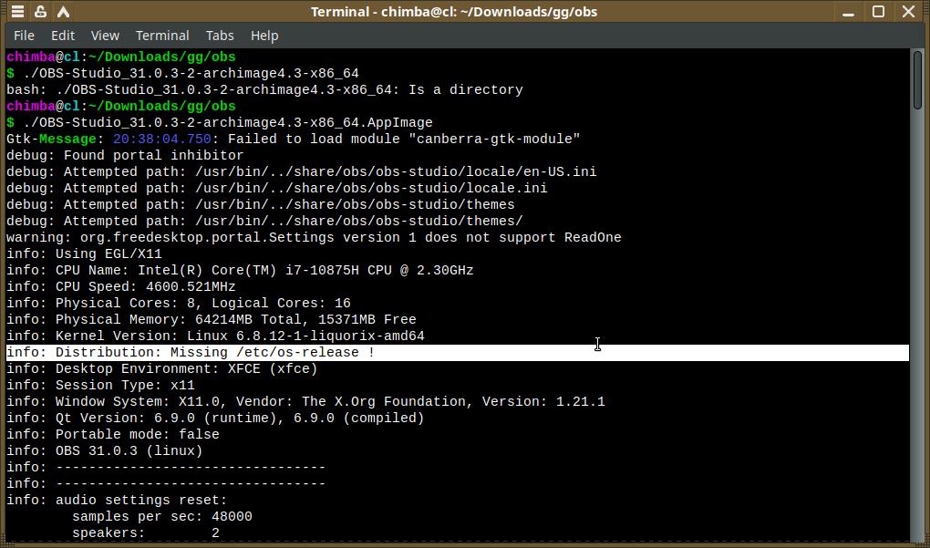 Ладно, вернёмся к OBS Studio, ради интереса запустил оригинальный AppImage, а то вдруг ссылки побились, когда распаковывал? Но нет, даже при запуске оригинального контейнера есть ругань на отсутствующие файлы вроде os-release, так что это точно не моя проблема.
