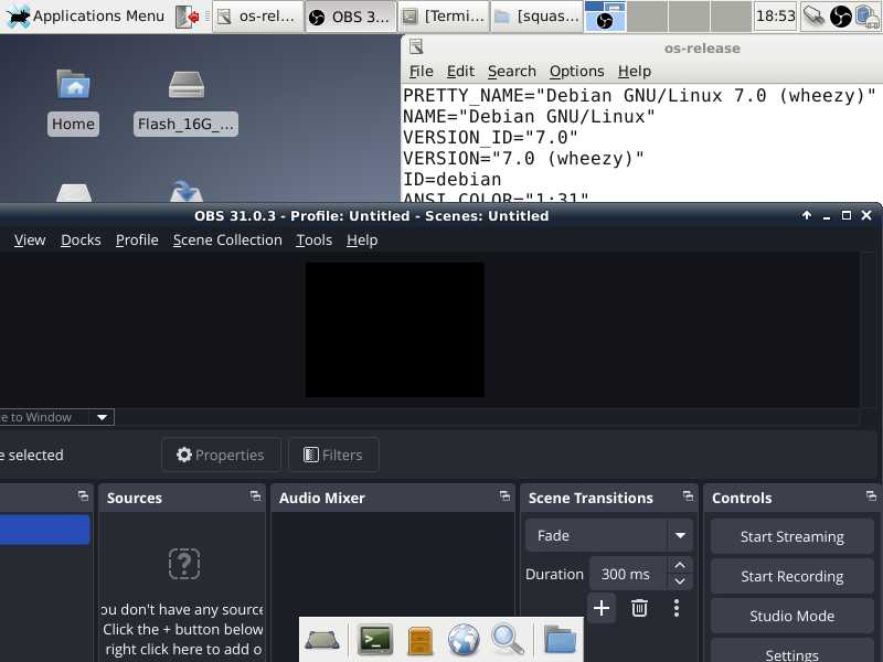 Так что, увы, вряд ли я буду использовать данную версию OBS Studio и не могу порекомендовать никому, но это был неплохой эксперимент, да и в случае крайней нужды, может быть, пригодится, всё же работает даже в старом Debian 7.