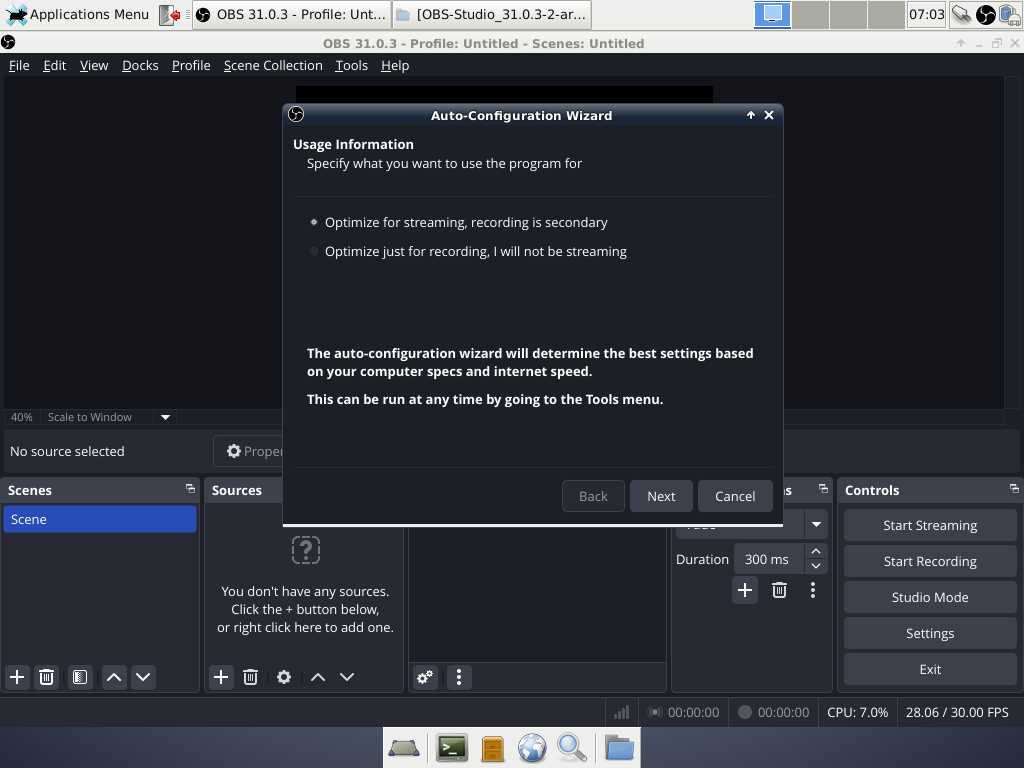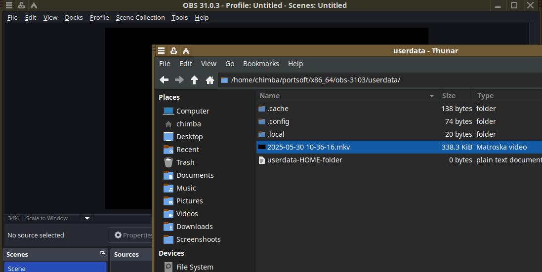 Ну и сам OBS Studio 31 версии запускается и работает, и в выделенном домашнем каталоге ничего не добавилось, ибо нет драйверов в виртуальной машине, библиотеки от которых можно было бы скопировать.