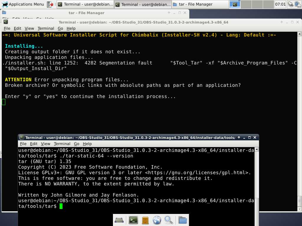Начинаем с Debian 7, и да, статически скомпилированный tar отказался нормально работать, хотя просто так вроде нормально запускается, ох уж этот Linux...