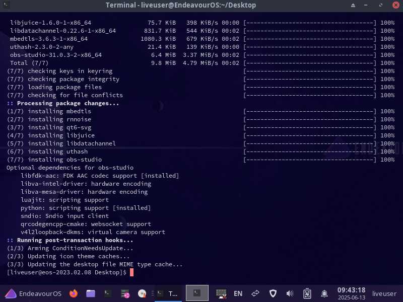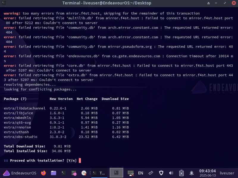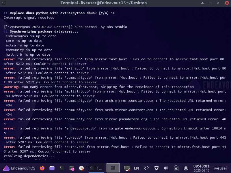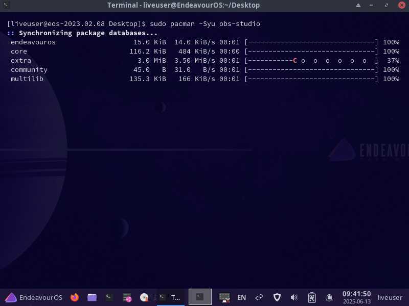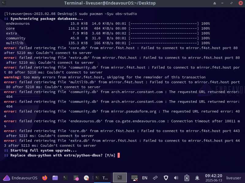 Но погодите, ранее была допущена недоработка с моей стороны. Я рассмотрел и проверил команду «sudo pacman -S obs-studio» по советам линуксоидов, ни в Arch, ни в EndeavourOS, оно не сработало.