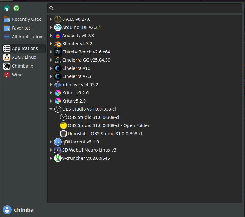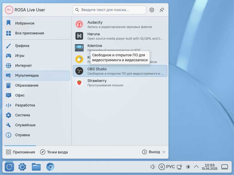 Как там говорил линуксоид? Зайди в пуск, утилиты, пакеты, и просто выбери obs? Но беда в том, что уже на первом этапе возникла проблема, нет никакого раздела «утилиты». Да и после структурированного меню в дистрибутиве Chimbalix — меню «Росы» выглядит как свалка, всё разбросано абы как, классика подавляющего большинства Линуксов.