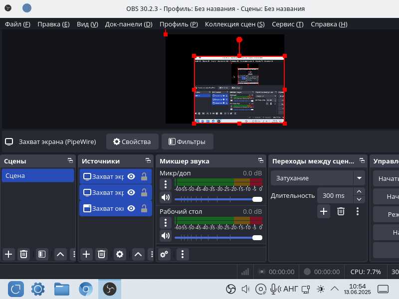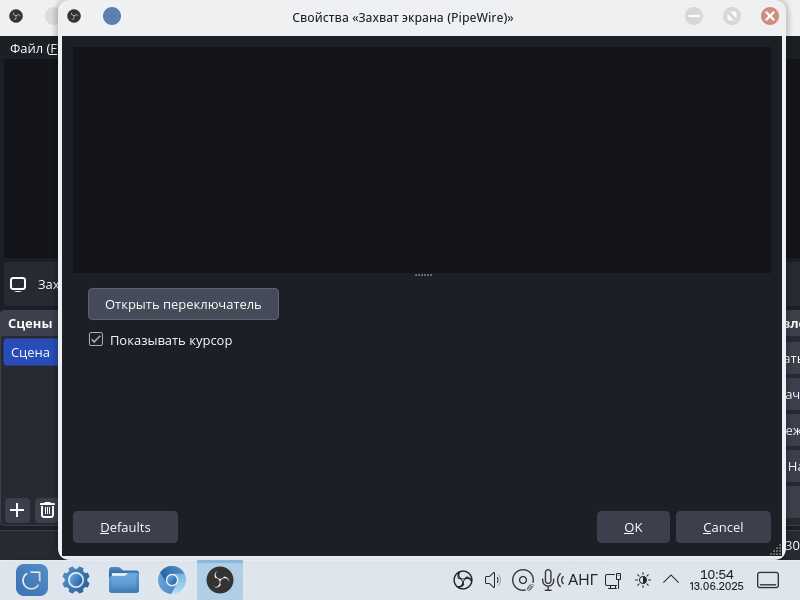 Первая проблема в нерабочем захвате окна, но это типичная беда OBS, просто не дружит с вечно кривым Mesa3D, ибо он предоставляет кривой и поломанный OpenGL API, прямо как у вечно кривых драйверов видеокарт AMD. А вот проблему с захватом экрана через PipeWire я не ожидал, кнопка «открыть переключатель» попросту не работает, но тут нужно сказать «спасибо» вечно кривому и недоработанному Wayland, либо разработчикам дистрибутива поломавшим что-то, либо обоим сразу.