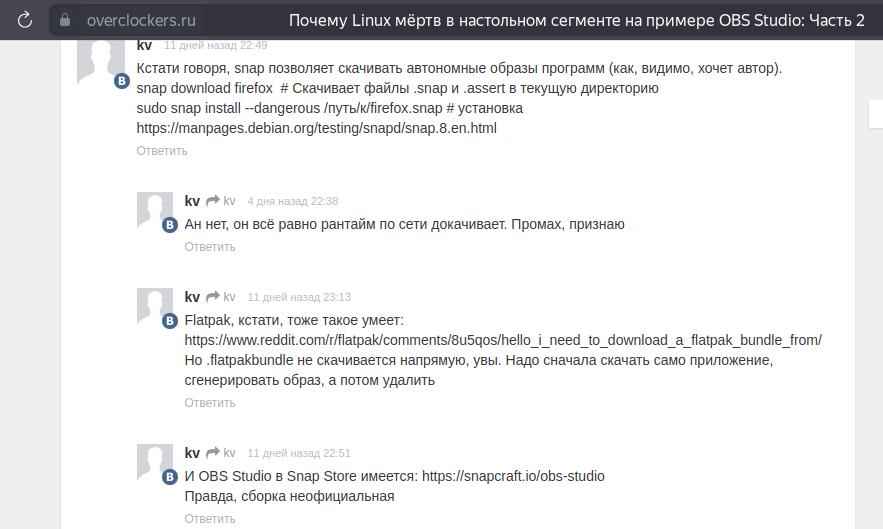 Что там про Snap говорили... сейчас найду... Ага, вот оно: Flatpak я уже проверил, говорить там больше нечего. А по теме Snap есть вопросы. Комментатор, судя по всему, сам не понимает, как оно там работает, и работает ли вообще.