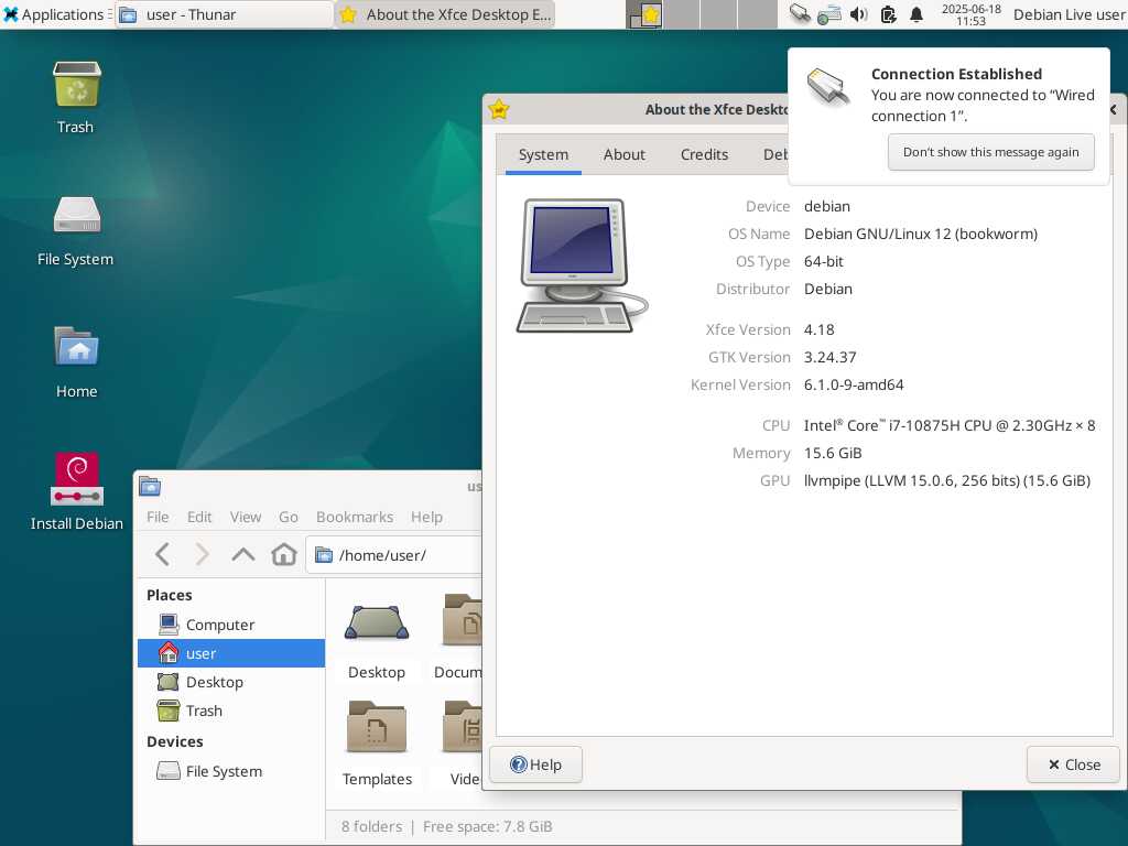 Так что запускаю чистый Debian 12, подключаю интернет виртуальной машине. Ведь без интернета линуксоидные способы распространения софта априори мертвы, ибо не получиться просто скачать установочный файл, и флешкой закинуть куда надо.